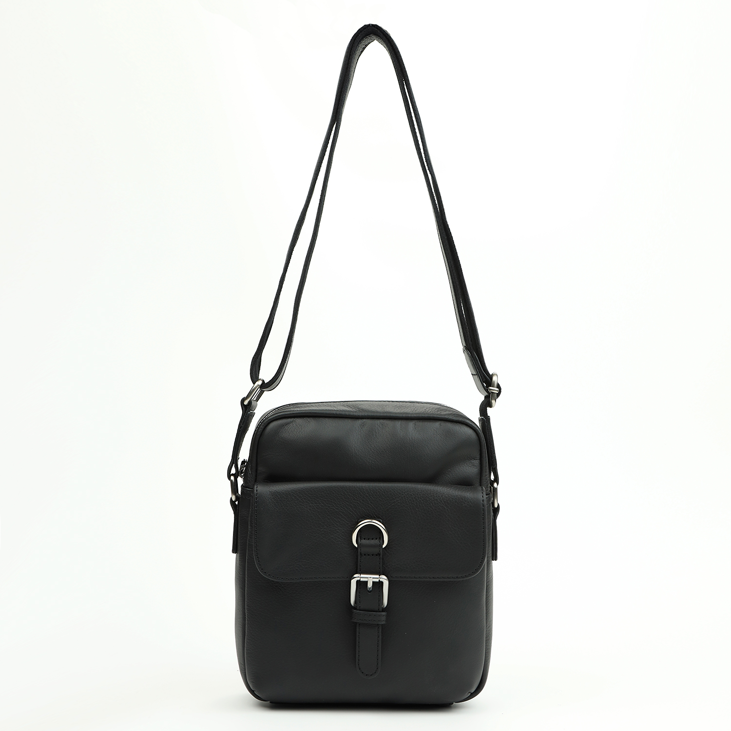 Основное отделение закрывается на металлическую молнию. Внутри один открытый карман и один на молнии. На лицевой стороне расположен открытый карман, закрывающийся клапаном с магнитной кнопкой и стильной декоративной пряжкой. На тыльной стороне карман быстрого доступа на молнии. Плечевой ремень из сочетания кожи и прочного текстиля регулируется по длине, ширина - 3 см. Цвет фурнитуры – матовое серебро.