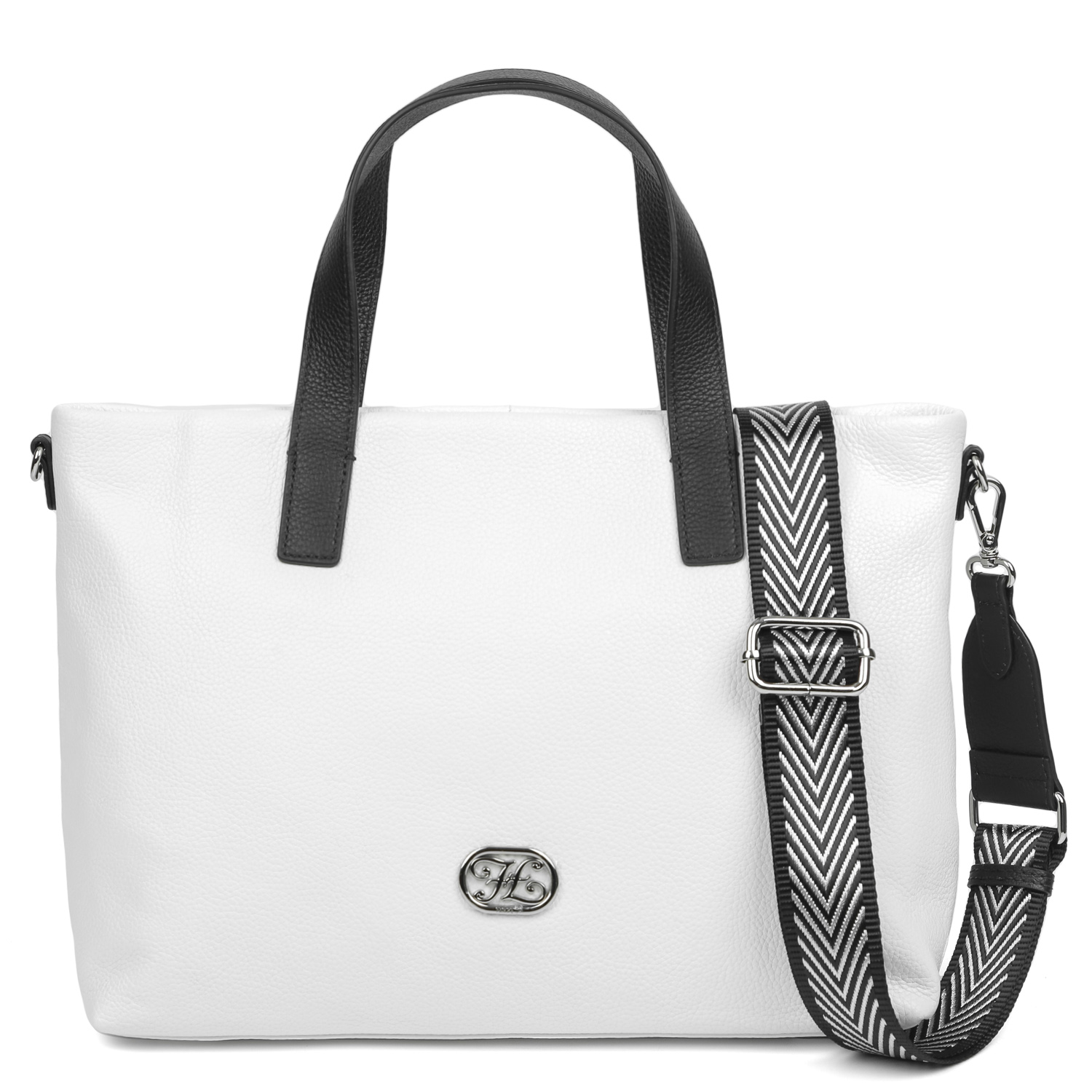Вместительная сумка-тоут FABRETTI в белом цвете выполнена из натуральной зернистой кожи. Основное отделение закрывается на молнию с металлическим поводком. Внутри есть 3 боковых кармана: 2 открытых и на молнии. На тыльной стороне предусмотрен карман быстрого доступа на молнии. Две ручки контрастного цвета позволяют комфортно носить аксессуар в руке. В комплекте идет съемный плечевой ремень из текстиля, ширина - 4 см. Модель вмещает формат А4. Цвет фурнитуры - серебро.