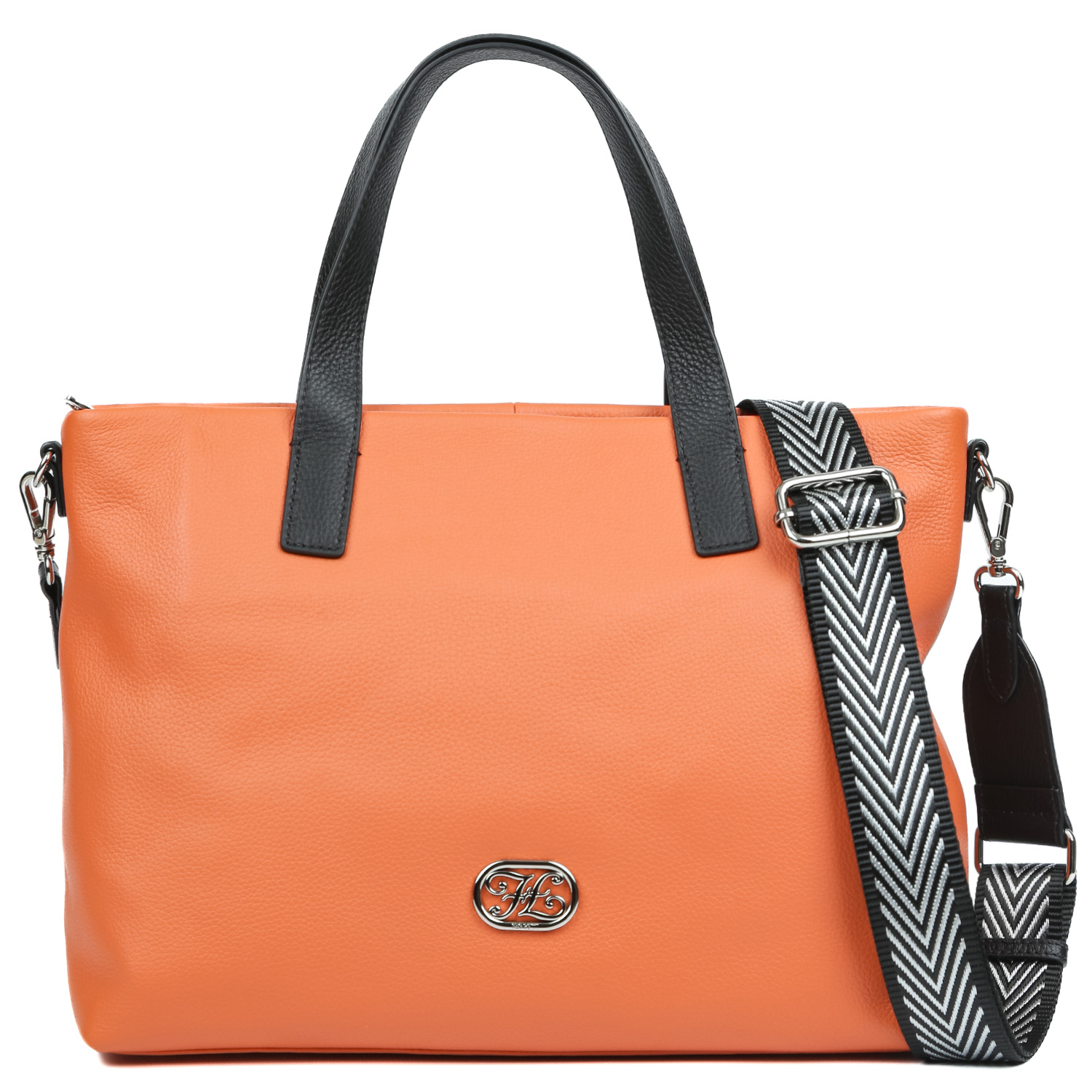 Вместительная сумка-тоут FABRETTI в оранжевом оттенке выполнена из натуральной зернистой кожи. Основное отделение закрывается на молнию с металлическим поводком. Внутри есть 3 боковых кармана: 2 открытых и на молнии. На тыльной стороне предусмотрен карман быстрого доступа на молнии. Две ручки контрастного цвета позволяют комфортно носить аксессуар в руке. В комплекте идет съемный плечевой ремень из текстиля, ширина - 4 см. Модель вмещает формат А4. Цвет фурнитуры - серебро.