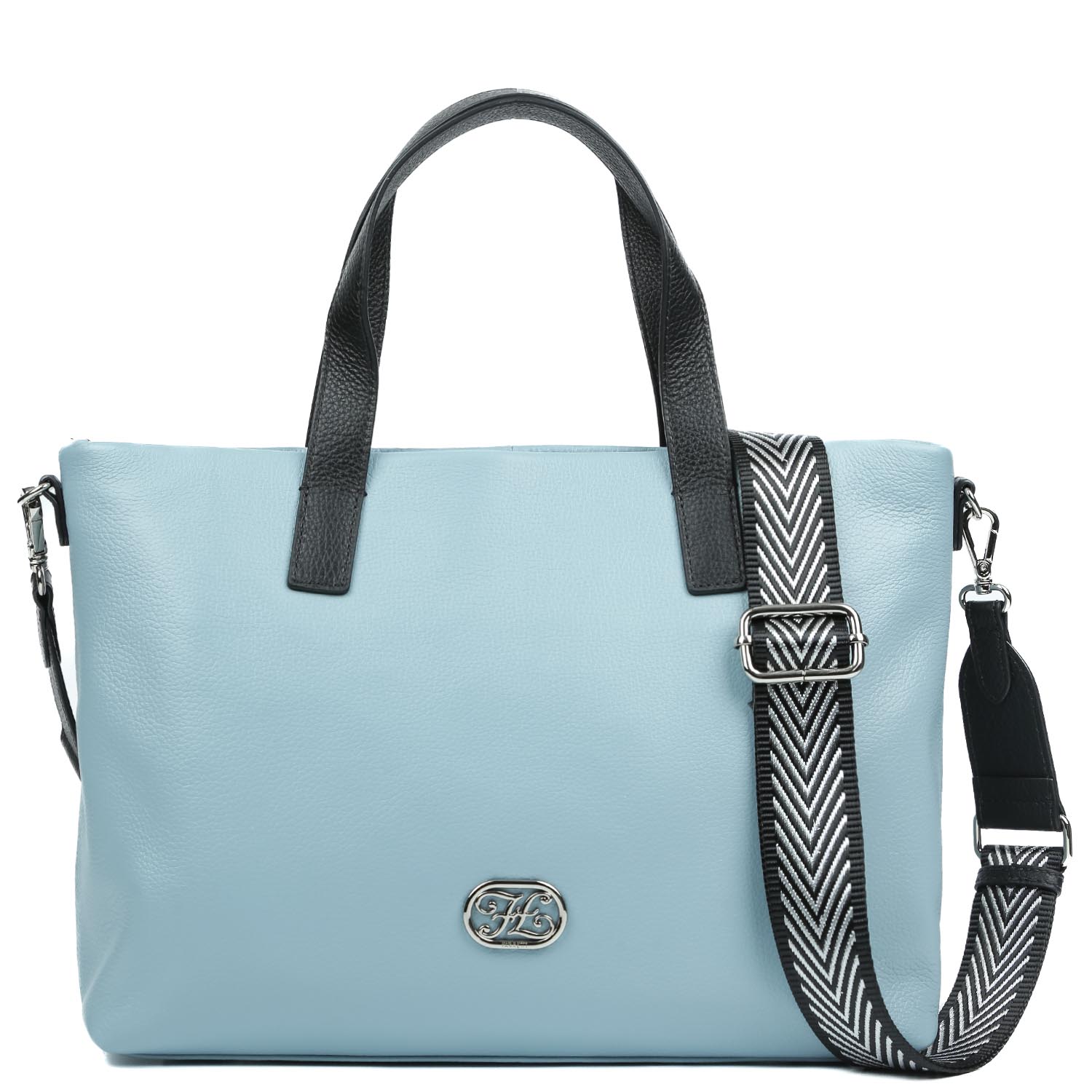 Вместительная сумка-тоут FABRETTI в голубом оттенке выполнена из натуральной зернистой кожи. Основное отделение закрывается на молнию с металлическим поводком. Внутри есть 3 боковых кармана: 2 открытых и на молнии. На тыльной стороне предусмотрен карман быстрого доступа на молнии. Две ручки контрастного цвета позволяют комфортно носить аксессуар в руке. В комплекте идет съемный плечевой ремень из текстиля, ширина - 4 см. Модель вмещает формат А4. Цвет фурнитуры - серебро.