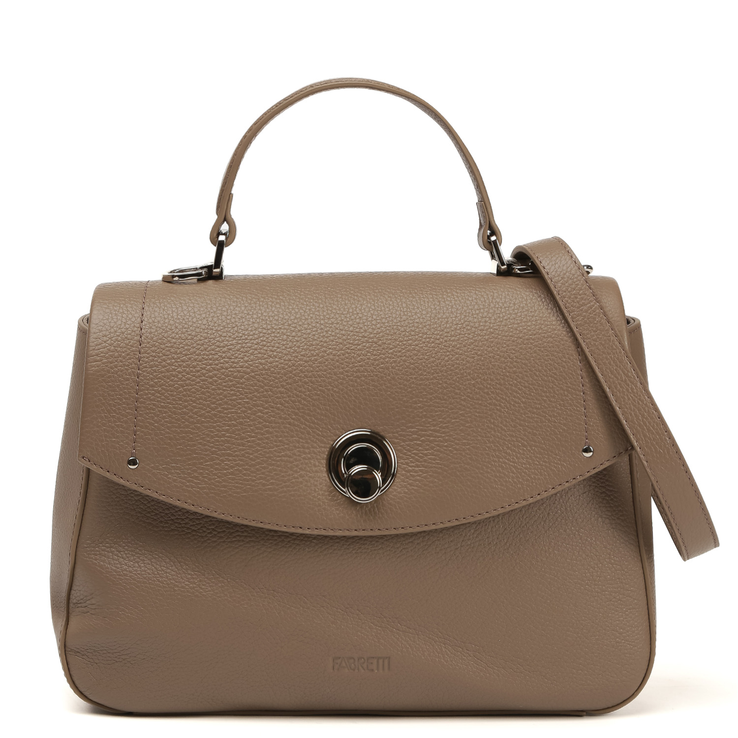 Компактная сумка-сэтчел FABRETTI в бежевом оттенке выполнена из натуральной зернистой кожи. Отлично держит форму. Основное отделение закрывается клапаном с поворотным замком. Внутри 2 кармана для мелочей: открытый и на молнии. На тыльной стороне предусмотрен карман быстрого доступа на молнии. Сверху предусмотрена ручка, позволяющая комфортно носить аксессуар в руке. Съемный плечевой ремень регулируется по длине, ширина - 1,5 см. Цвет фурнитуры - серебро.
