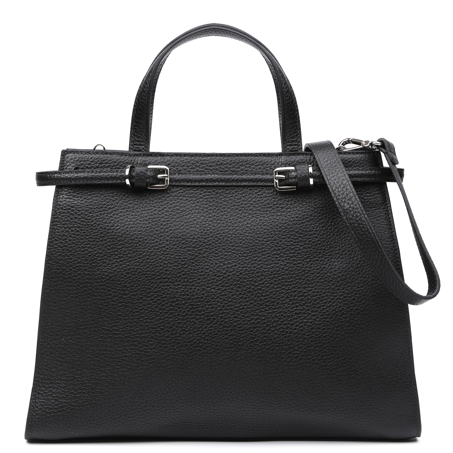 Стильная сумка-тоут FABRETTI в черном цвете выполнена из натуральной высококачественной зернистой кожи, приятной на ощупь. Просторное отделение закрывается на потайные магниты. Внутри 2 кармана для мелочей: открытый и на молнии. На тыльной стороне предусмотрен карман быстрого доступа на молнии. Верхняя часть декорирована изящным ремешком. Дно сумки защищают 4 металлические ножки. Две ручки позволяют комфортно носить аксессуар в руке. Съемный плечевой ремень регулируется по длине, ширина - 2 см. Цвет фурнитуры - серебро.