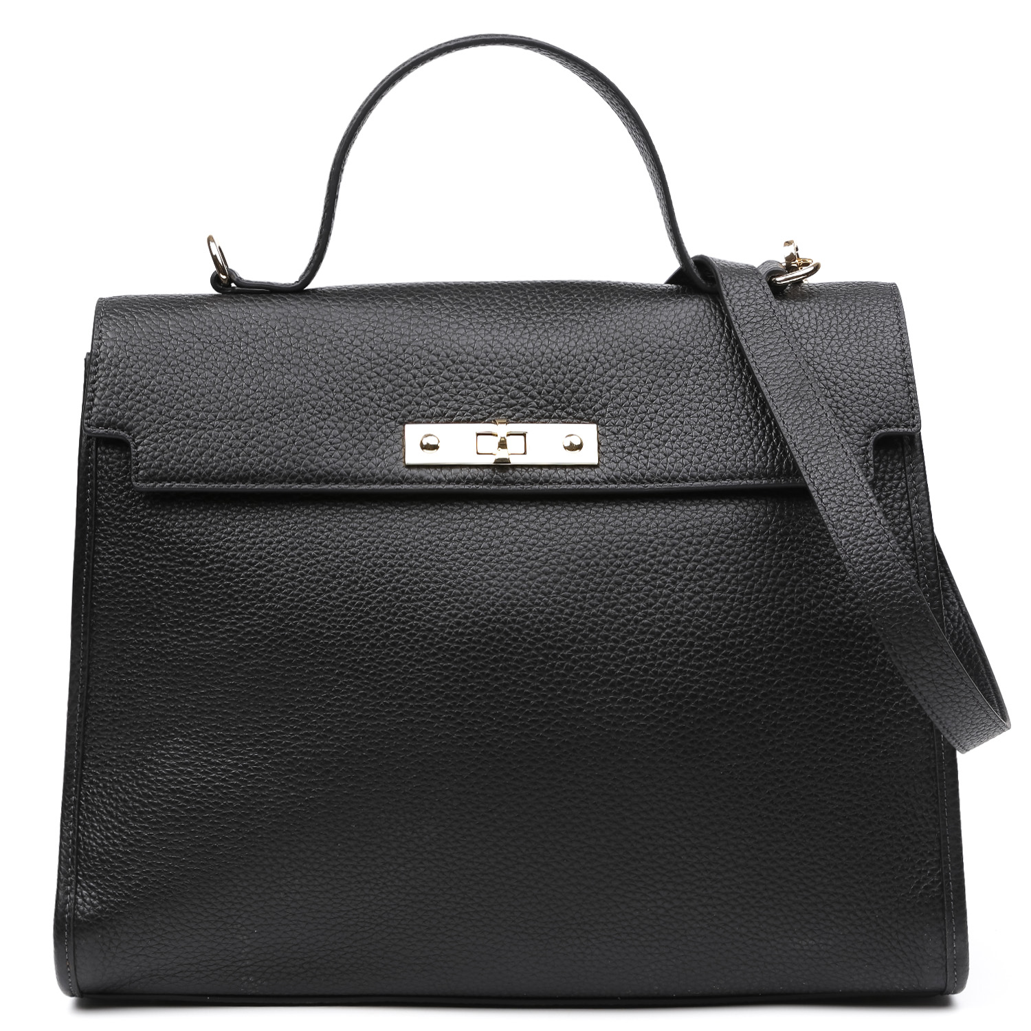 Вместительная сумка-сэтчел FABRETTI в черном цвете выполнена из натуральной высококачественной зернистой кожи, приятной на ощупь. Сумка закрывается клапаном с поворотным замком. Внутри 2 отдела, разделённые карманом на молнии, 2 открытых кармана для мелочей и карман на кнопке. На тыльной стороне раположен вместительный карман на магнитной кнопке. Дно сумки защищают 4 металлические ножки. Ручка сверху позволяет комфортно носить аксессуар в руке. Плечевой ремень съемный, длина - 108 см, ширина - 2 см. Вмещает формат А4. Цвет фурнитуры - золото.