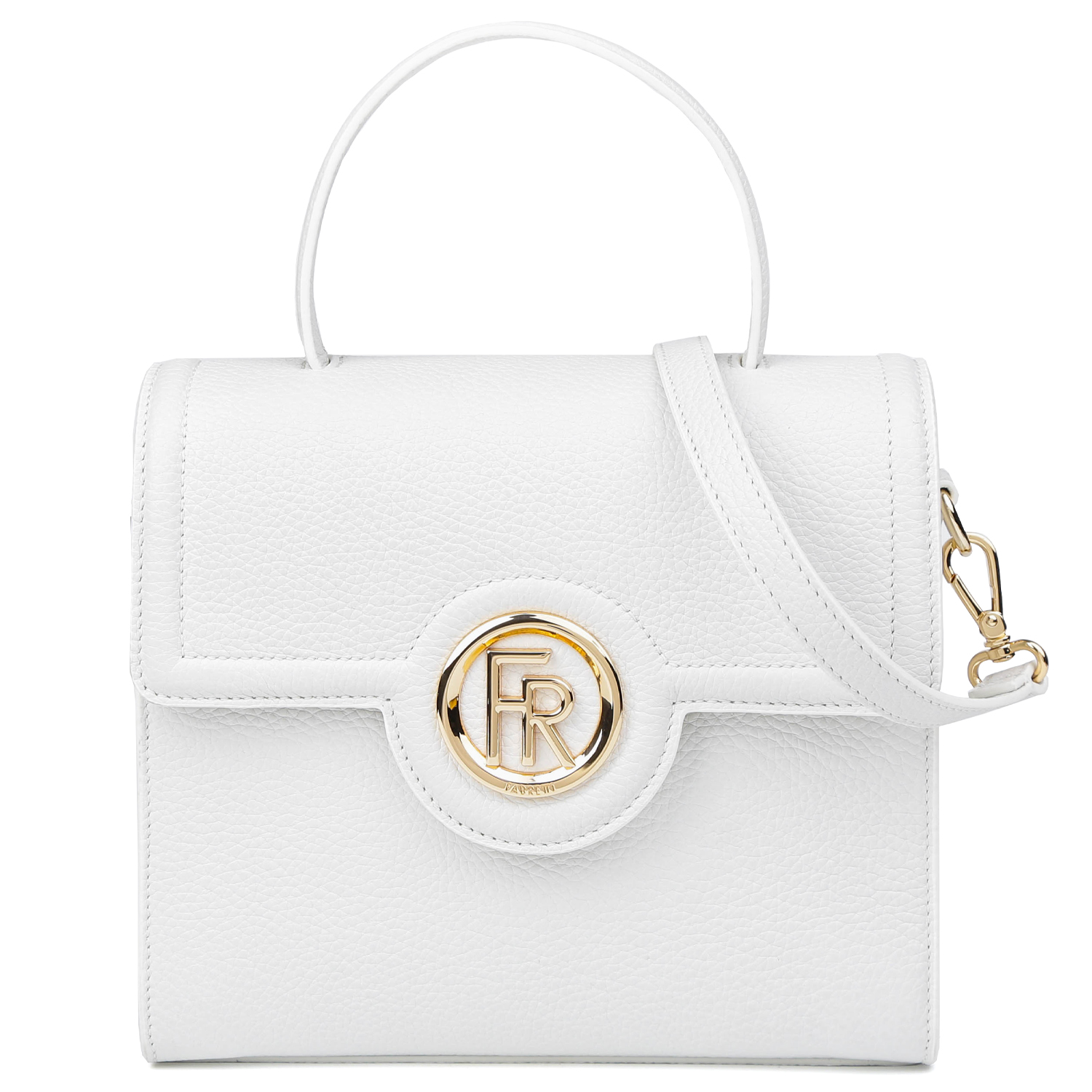 Стильная сумка-сэтчел FABRETTI в белом цвете выполнена из натуральной высококачественной зернистой кожи, приятной на ощупь. Основное отделение закрывается клапаном с магнитной кнопкой. Внутри 3 кармана для мелочей: 2 открытых и на молнии. Лицевая сторона декорирована фурнитурой с монограммой бренда. На тыльной стороне предусмотрен карман быстрого доступа на молнии. Ручка сверху позволяет комфортно носить аксессуар в руке. Съемный плечевой ремень регулируется по длине, ширина - 1,5 см. Цвет фурнитуры - золото.