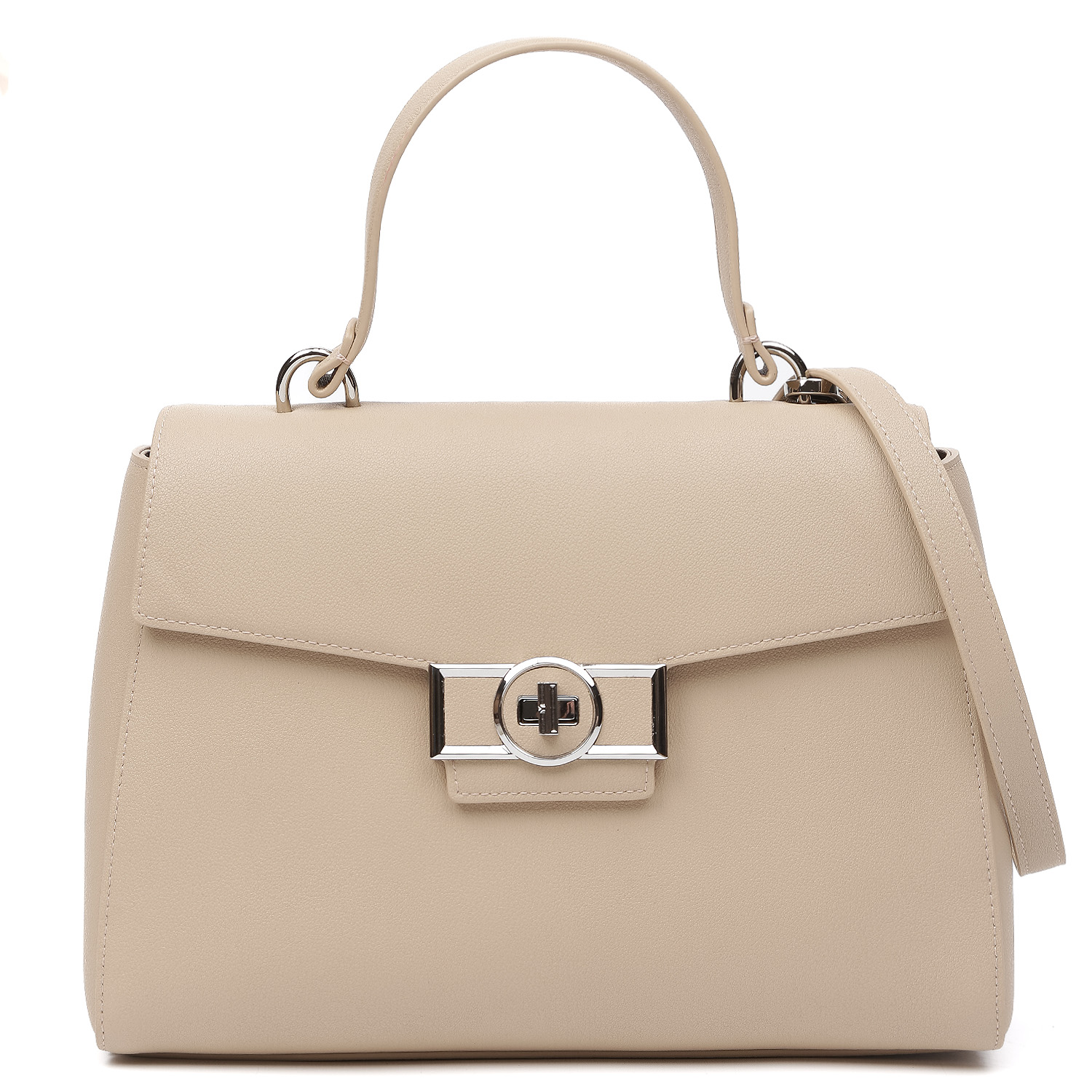 Стильная сумка-сэтчел FABRETTI в бежевом оттенке выполнена из натуральной высококачественной зернистой кожи, приятной на ощупь, плотной фактуры. Прекрасно держит форму. Сумка закрывается клапаном с поворотным замком, декорированным изящной пряжкой. Внутри 2 кармана для мелочей: открытый и на молнии. На тыльной стороне предусмотрен открытый карман быстрого доступа. Ручка сверху позволяет комфортно носить аксессуар в руке. Съемный плечевой ремень регулируется по длине, ширина - 1,5 см. Цвет фурнитуры - серебро.