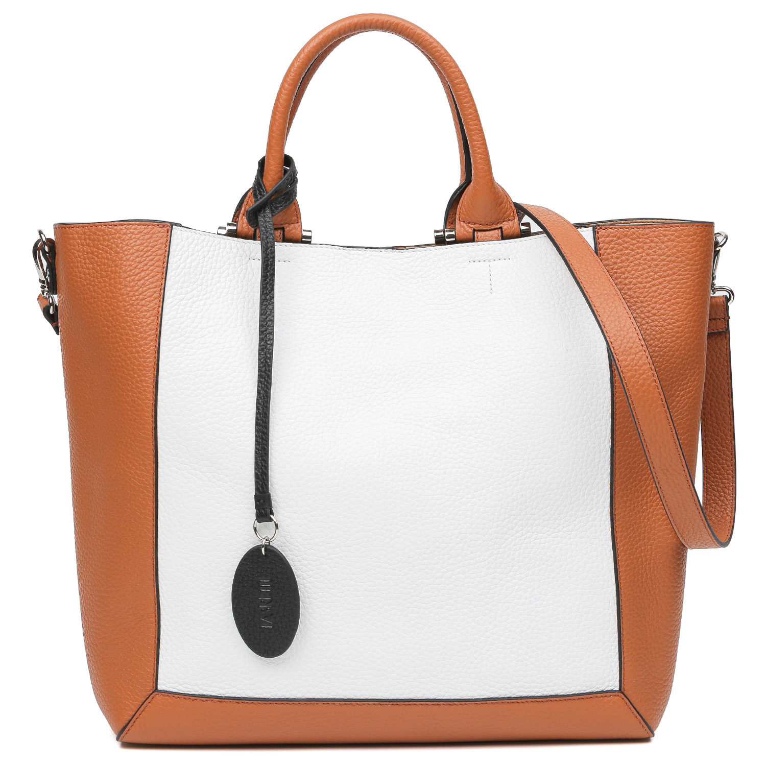 Вместительная сумка-тоут FABRETTI выполнена из натуральной высококачественной зернистой кожи, приятной на ощупь, и сочетает рыжий и белый оттенки. Приятная на ощупь кожа высокого качества гарантирует долговечность изделия. Основное отделение закрывается на магнитную кнопку. Внутренняя часть обладает фактурой, напоминающей велюр. Внутри есть карман на молнии и ремешок с карабином для ключей. Сумка дополнена внутренним мешочком на молнии. Две удобные ручки позволяют носить аксессуар в руке. Плечевой ремень съемный, длина - 108 см, ширина - 2 см. Вмещает формат А4. Цвет фурнитуры - серебро.
