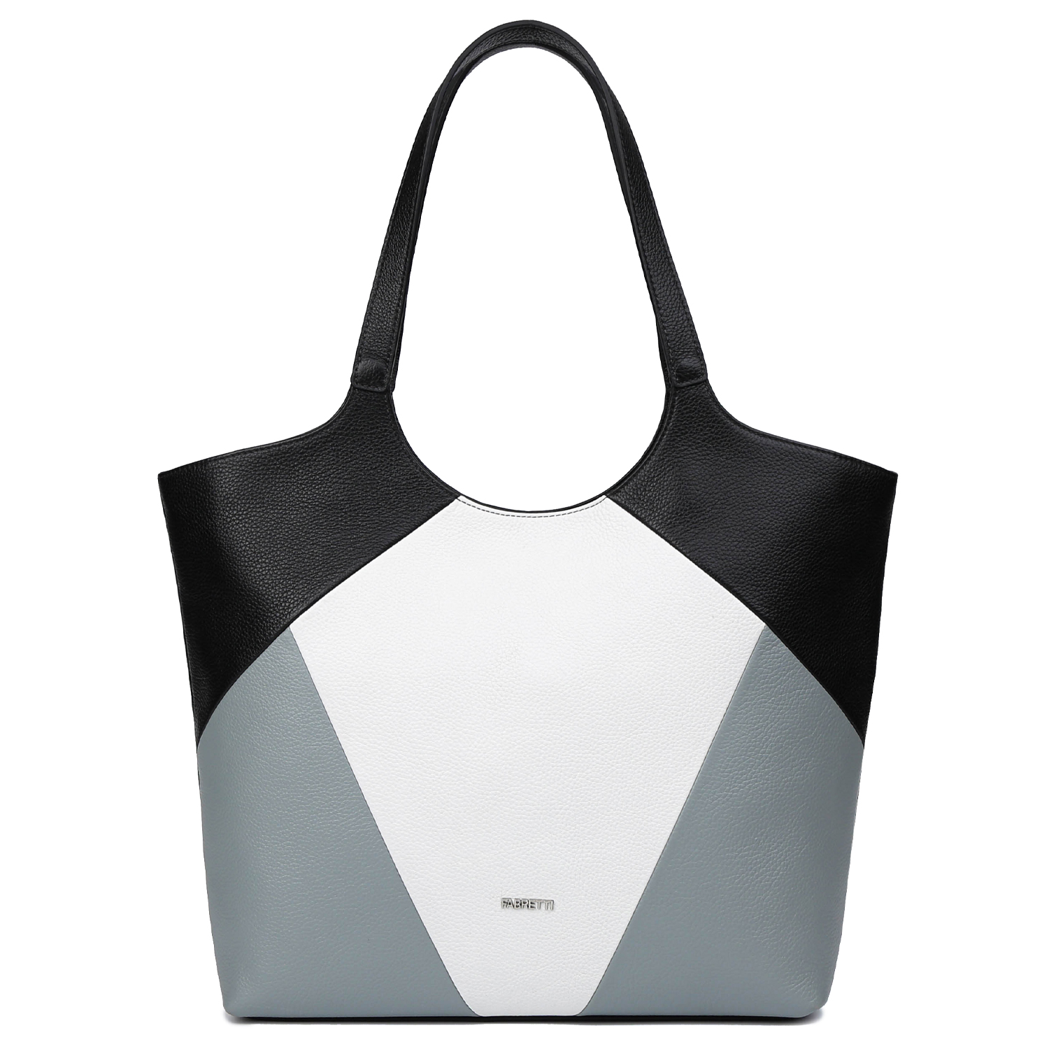 Вместительная сумка шоппер FABRETTI выполнена из натуральной кожи, приятной на ощупь, и гармонично сочетает 3 оттенка: черный, серый и белый оттенки. Основное отделение закрывается на молнию с кожаным поводком. Внутри 2 отдела, разделенные карманом на молнии, и 3 кармана для мелочей: 2 открытых и намолнии. На тыльной стороне предусмотрен карман быстрого доступа на молнии. Две ручки позволяют комфортно носить изделие на плече или в руке. Вмещает формат А4. Цвет фурнитуры - серебро.