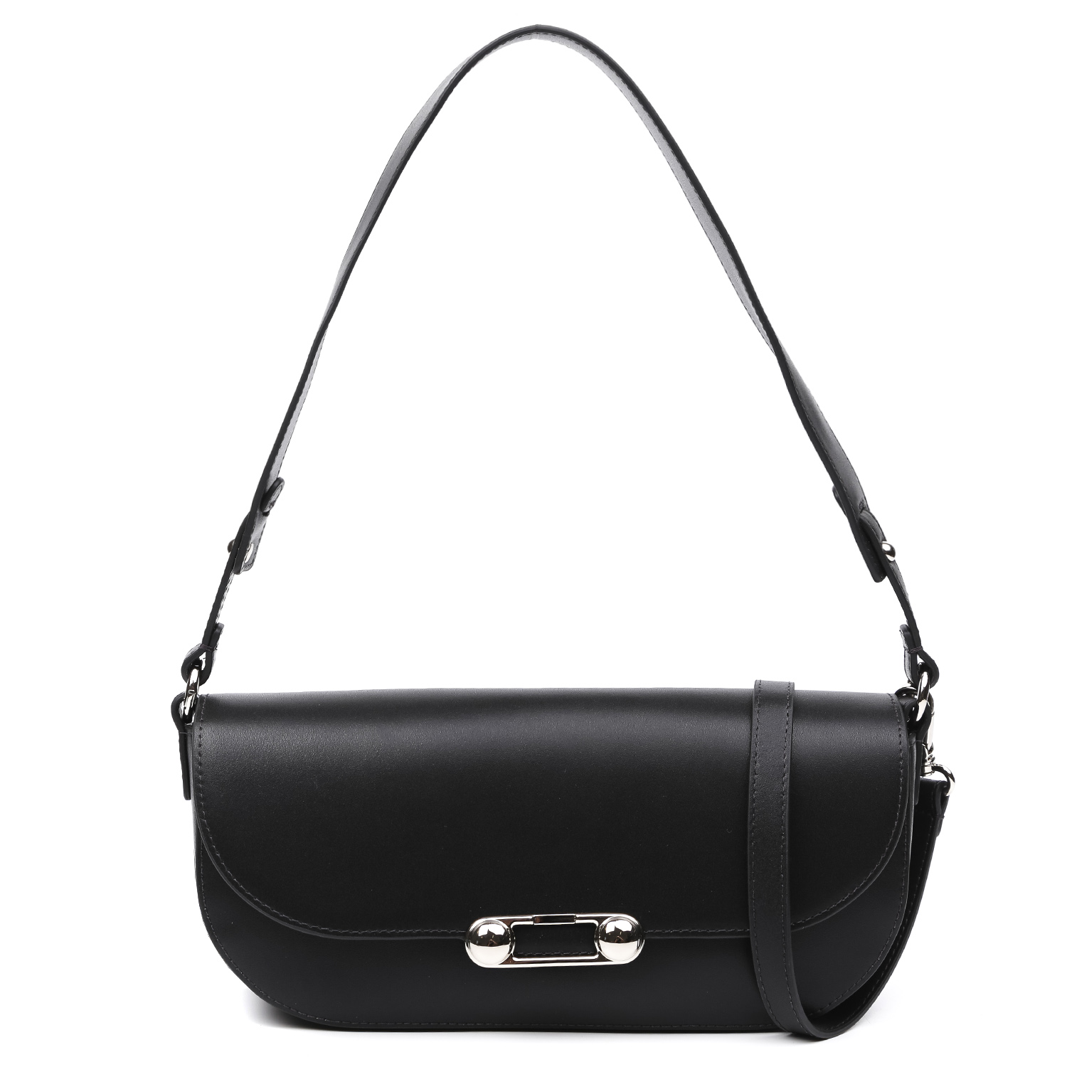 Стильная сумка на плечо FABRETTI в черном цвете выполнена из натуральной высококачественной кожи плотной гладкой фактуры, приятной на ощупь. Отлично держит форму. Сумка закрывается клапаном на магнитной кнопке. Внутри 2 кармана для мелочей: открытый и на молнии. Лицевая сторона декорирована оригинальной фурнитурой. В комплекте 2 съемных плечевых ремня. Длина первого - 55 см, ширина - 2,5 см; второй плечевой ремень регулируется по длине, ширина - 1,5 см. Цвет фурнитуры - серебро.