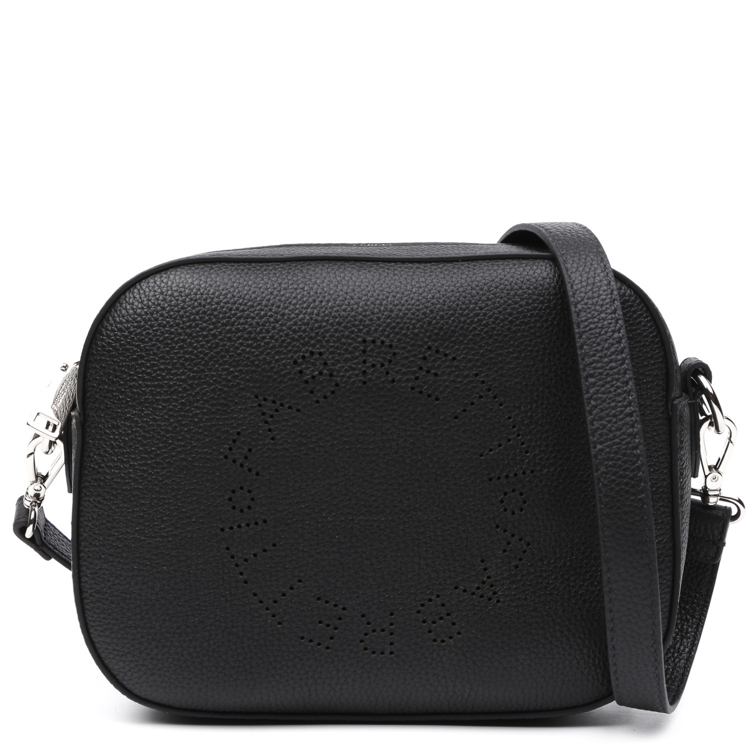 Компактная сумка кросс-боди FABRETTI в черном цвете выполнена из натуральной высококачественной зернистой кожи, приятной на ощупь, и на лицевой стороне декорирована перфорацией с логотипом бренда. Сумка закрывается на полукруглую молнию. Внутри 2 кармана для мелочей: открытый и на молнии. Съемный плечевой ремень регулируется по длине, ширина - 2 см. Цвет фурнитуры - серебро.