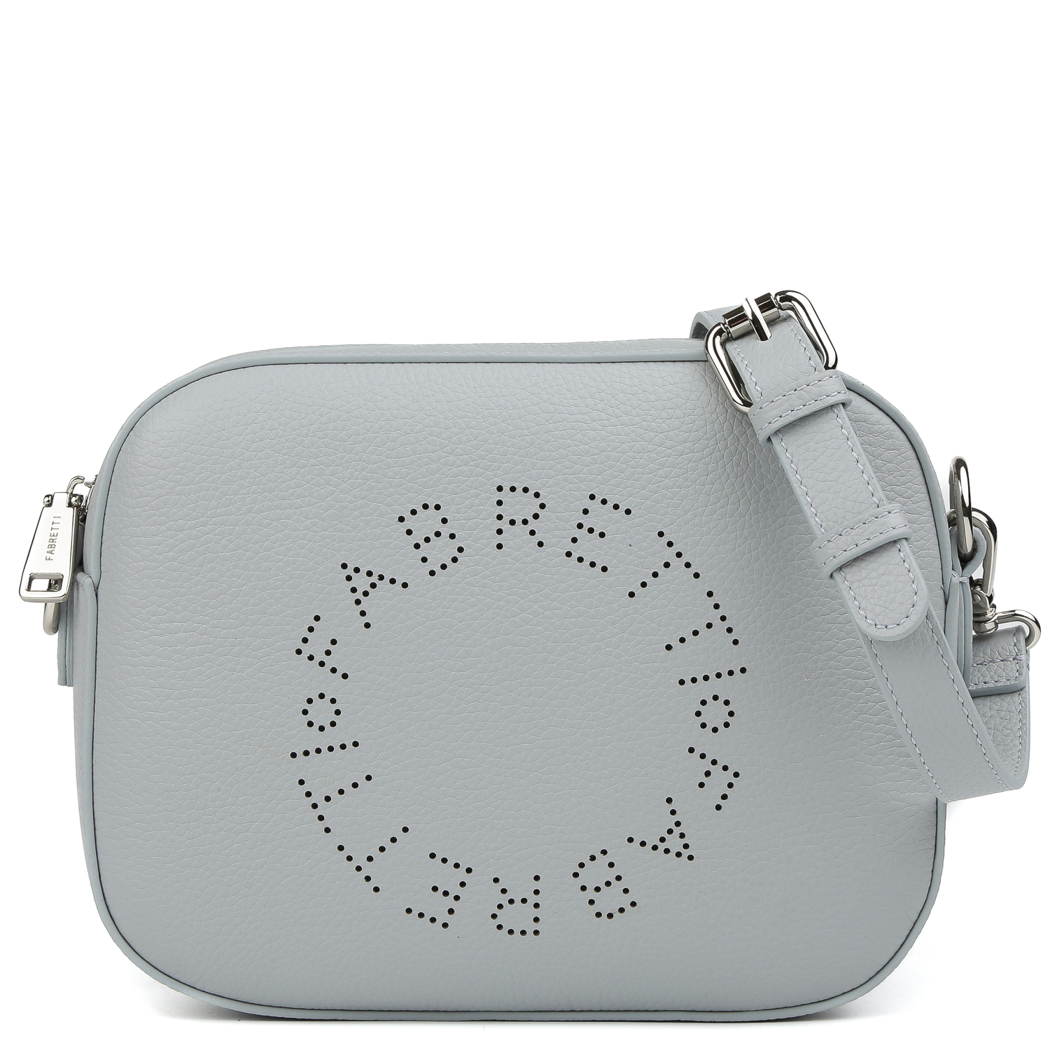 Компактная сумка кросс-боди FABRETTI в светло-голубом цвете выполнена из натуральной высококачественной зернистой кожи, приятной на ощупь, и на лицевой стороне декорирована перфорацией с логотипом бренда. Сумка закрывается на полукруглую молнию. Внутри 2 кармана для мелочей: открытый и на молнии. Съемный плечевой ремень регулируется по длине, ширина - 2 см. Цвет фурнитуры - серебро.