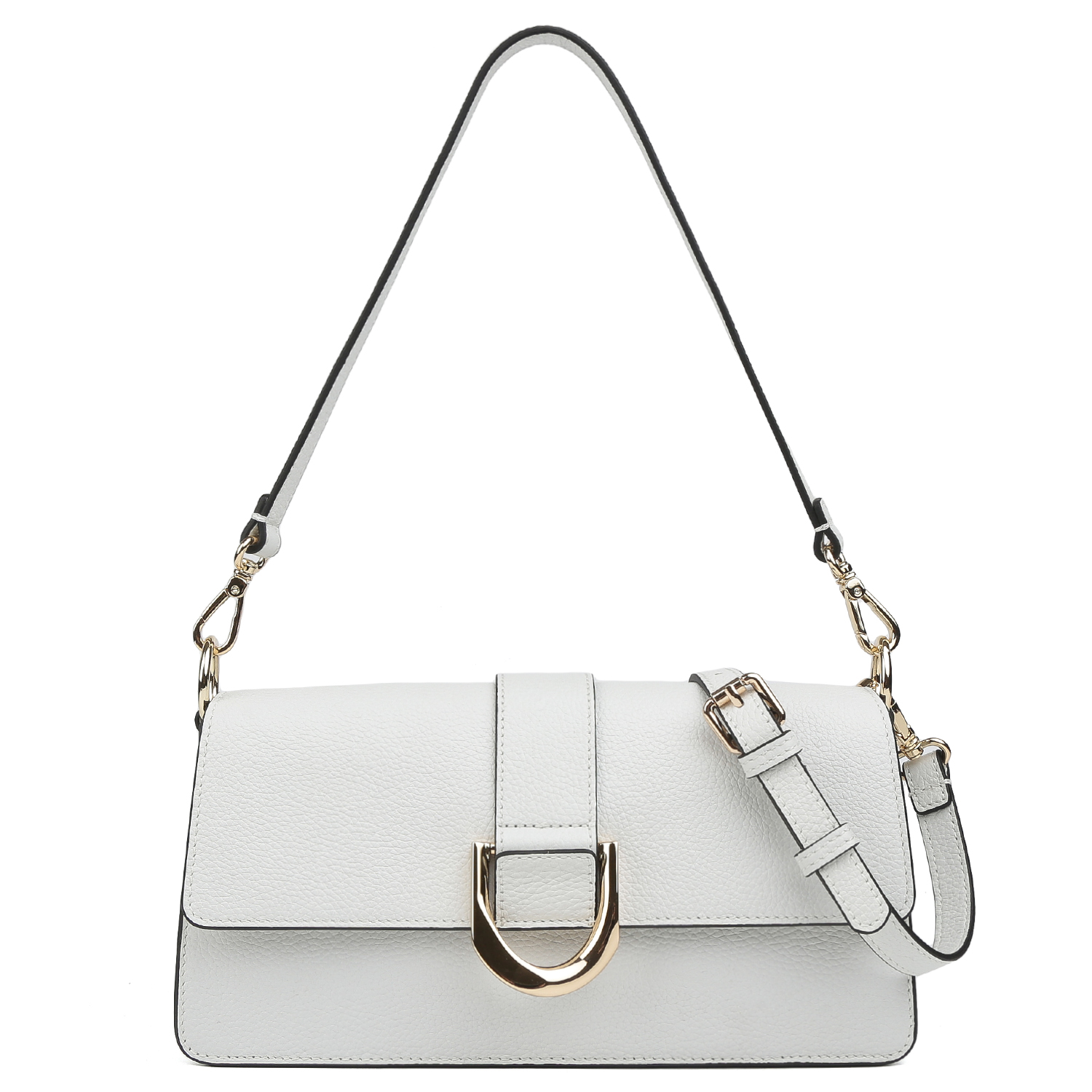 Стильная сумка кросс-боди FABRETTI в белом цвете выполнена из натуральной высококачественной зернистой кожи, приятной на ощупь. Отлично держит форму. Сумка закрывается клапаном с магнитной кнопкой, в качестве декора выбрана эффектная пряжка. Внутри есть 2 кармана для мелочей: открытый и на молнии. В комплекте 2 съемных плечевых ремня. Длина первого - 52 см, ширина - 1,5 см; второй плечевой ремень регулируется по длине, ширина - 1,5 см. Цвет фурнитуры - золото.