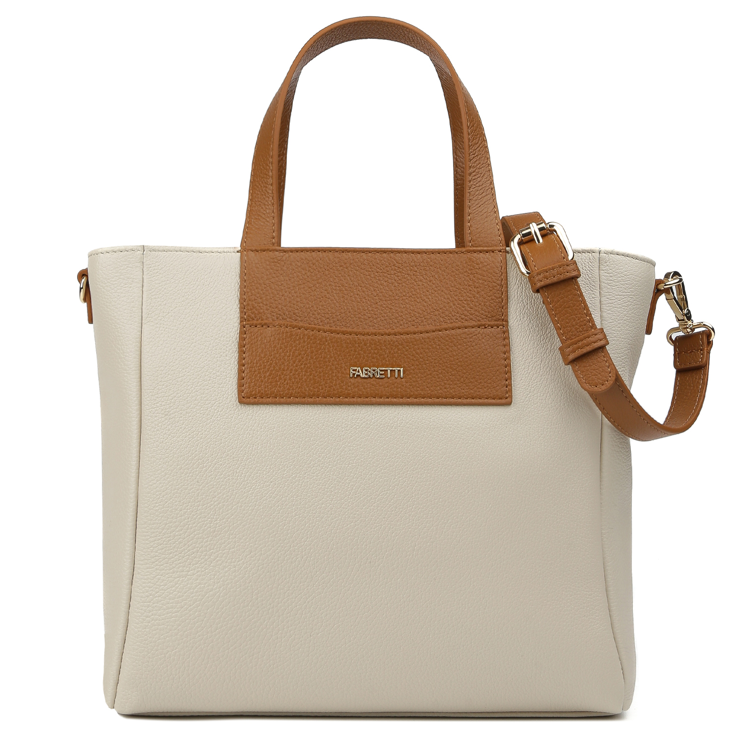 Стильная сумка-тоут FABRETTI выполнена из натуральной высококачественной зернистой кожи, приятной на ощупь, и гармонично сочетает коричневый и бежевый оттенки. Сумка закрывается на молнию с кожаным поводком. Внутри 2 отдела, разделенные карманом на молнии, а также 2 кармана для мелочей: открытый и на молнии. На тыльной стороне предусмотрен карман быстрого доступа на молнии. Две ручки позволяют комфортно носить аксессуар в руке. Съемный плечевой ремень регулируется по длине, ширина - 2 см. Цвет фурнитуры - золото.