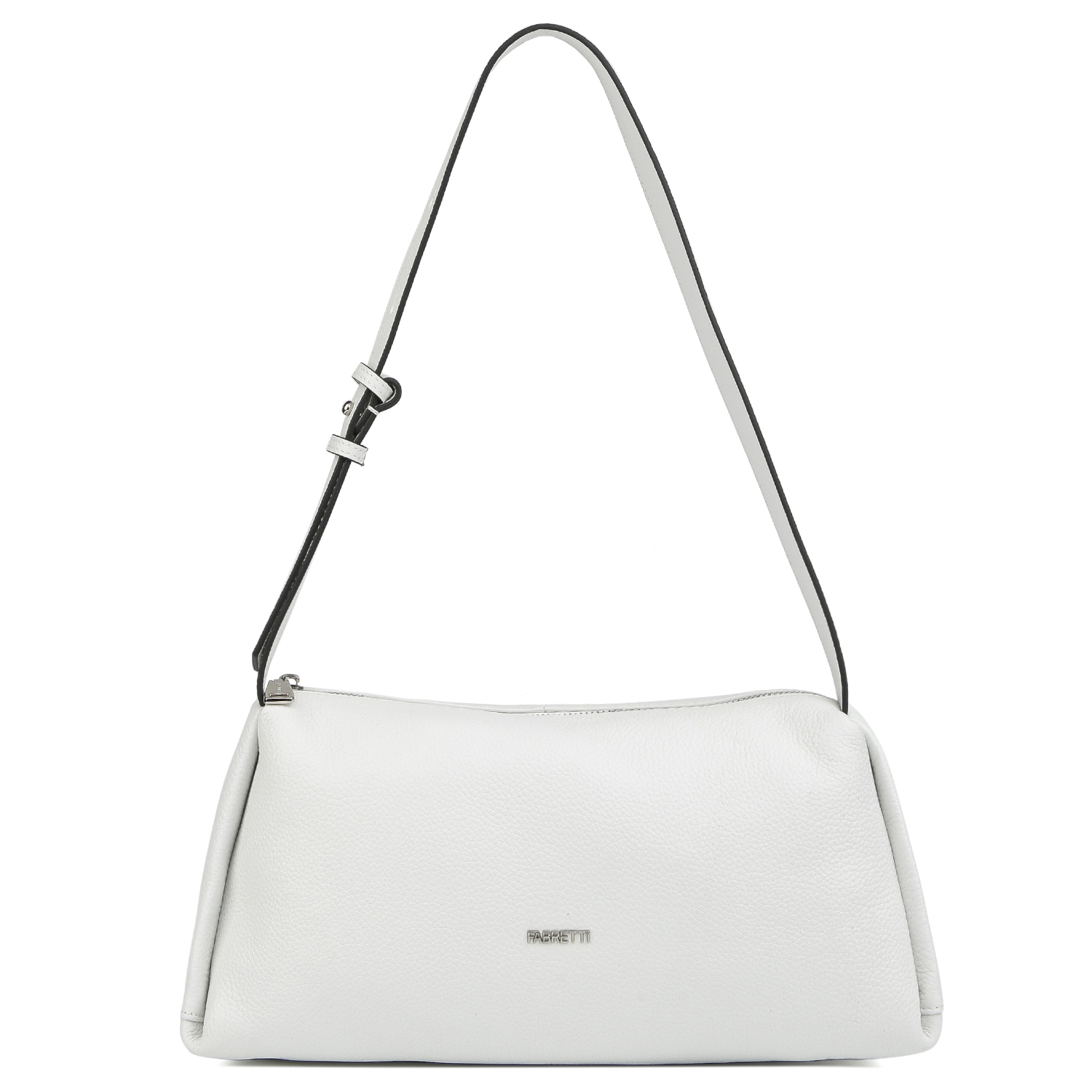 Стильная сумка на плечо FABRETTI выполнена из натуральной высококачественной зернистой кожи, приятной на ощупь, белого цвета. Основное отделение имеет застежку-молнию. Внутри сумки расположены два кармана: один открытый накладной карман и один врезной карман на молнии. На тыльной стороне предусмотрен карман быстрого доступа. Плечевой ремень имеет оригинальный дизайн и не является съемным. Цвет фурнитуры - серебро.