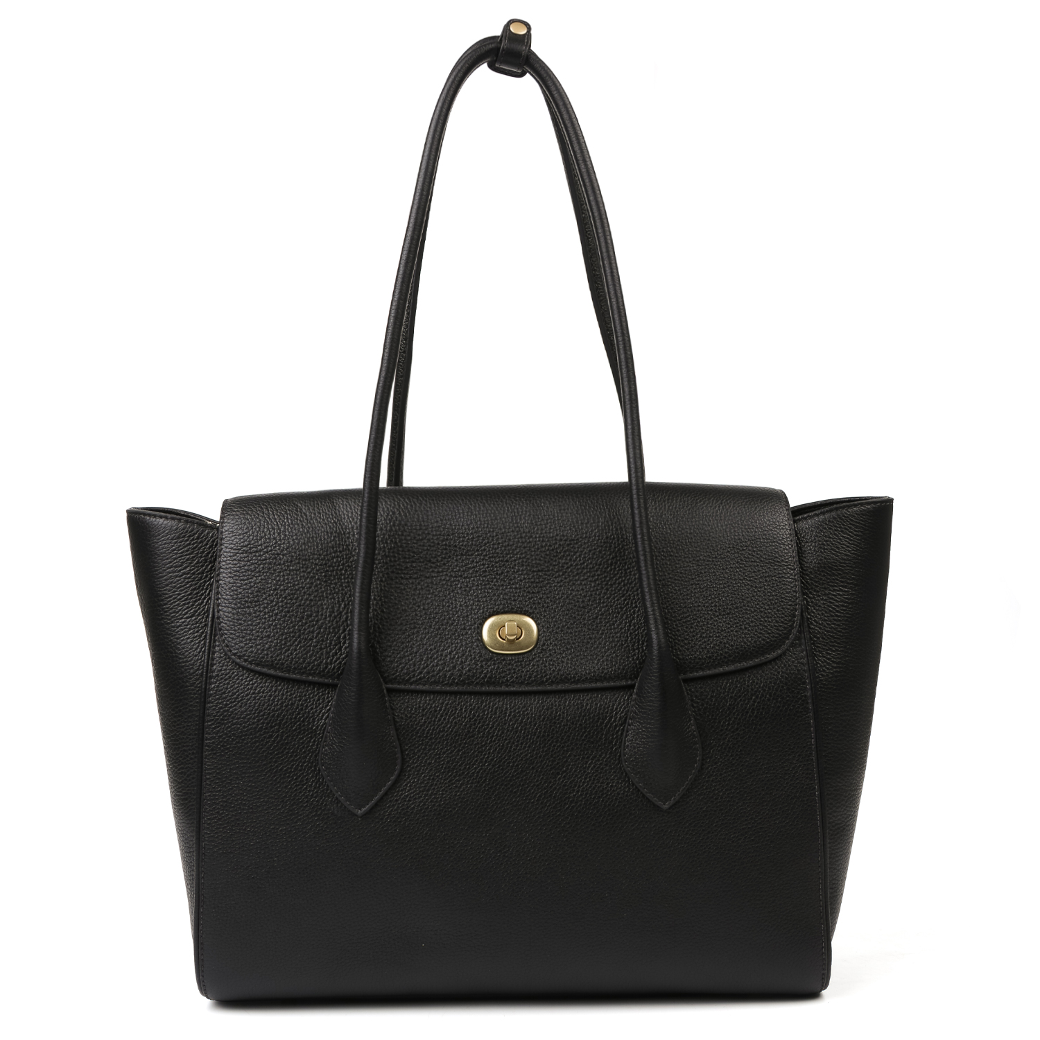 Элегантная деловая сумка-тоут FABRETTI в черном цвете, выполненная из натуральной высококачественной зернистой кожи. Закрывается на клапан с поворотным замком. Аксессуар имеет две удобные ручки. Основное отделение закрывается на молнию, внутри - три кармана: два открытых и один на молнии. Карман быстрого доступа на тыльной стороне. Материал подкладки: полиэстер. Цвет фурнитуры - золото. Изделие вмещает формат A4.
