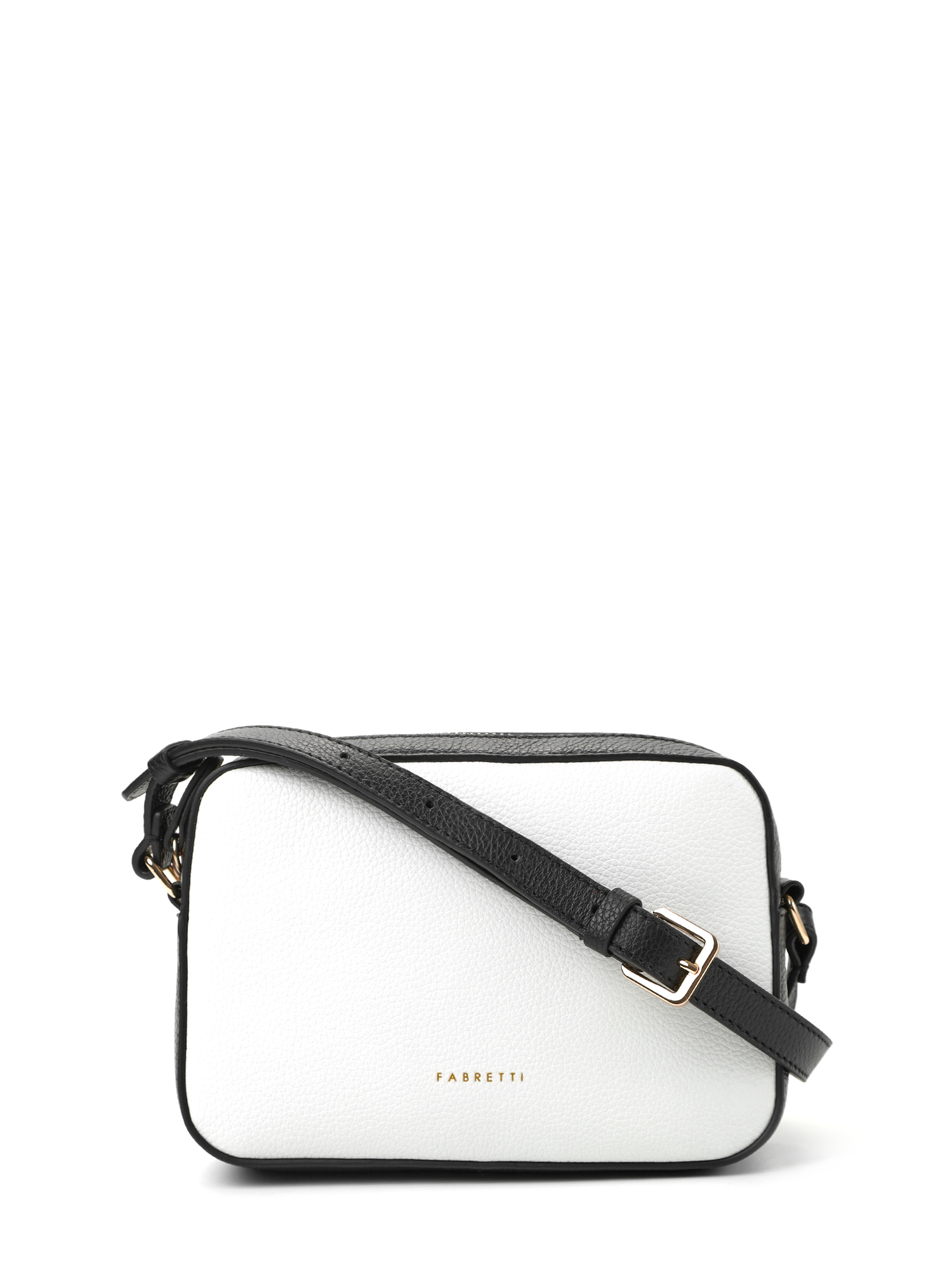 Городская женская сумка кросс-боди итальянского бренда FABRETTI из высококачественной натуральной кожи с мелкозернистой фактурой в необычном цветовом решении – лицевая и тыльная стороны белые, боковые части и узкий ремень – контрастно черные.