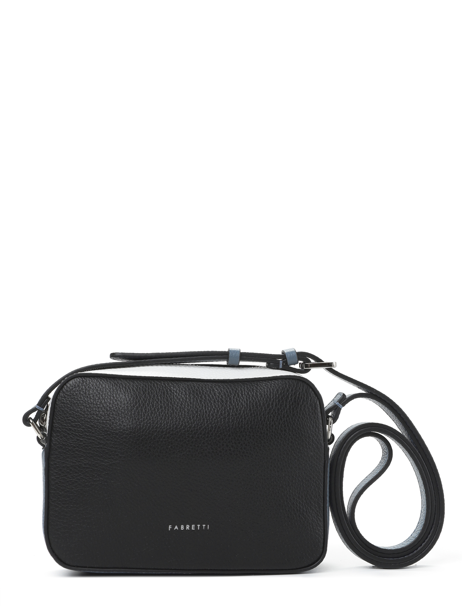 Городская женская сумка кросс-боди итальянского бренда FABRETTI из высококачественной натуральной кожи с мелкозернистой фактурой в необычном цветовом решении – лицевая и тыльная стороны черные, боковые части и узкий ремень – приглушенного серо-голубого цвета, верх белый.