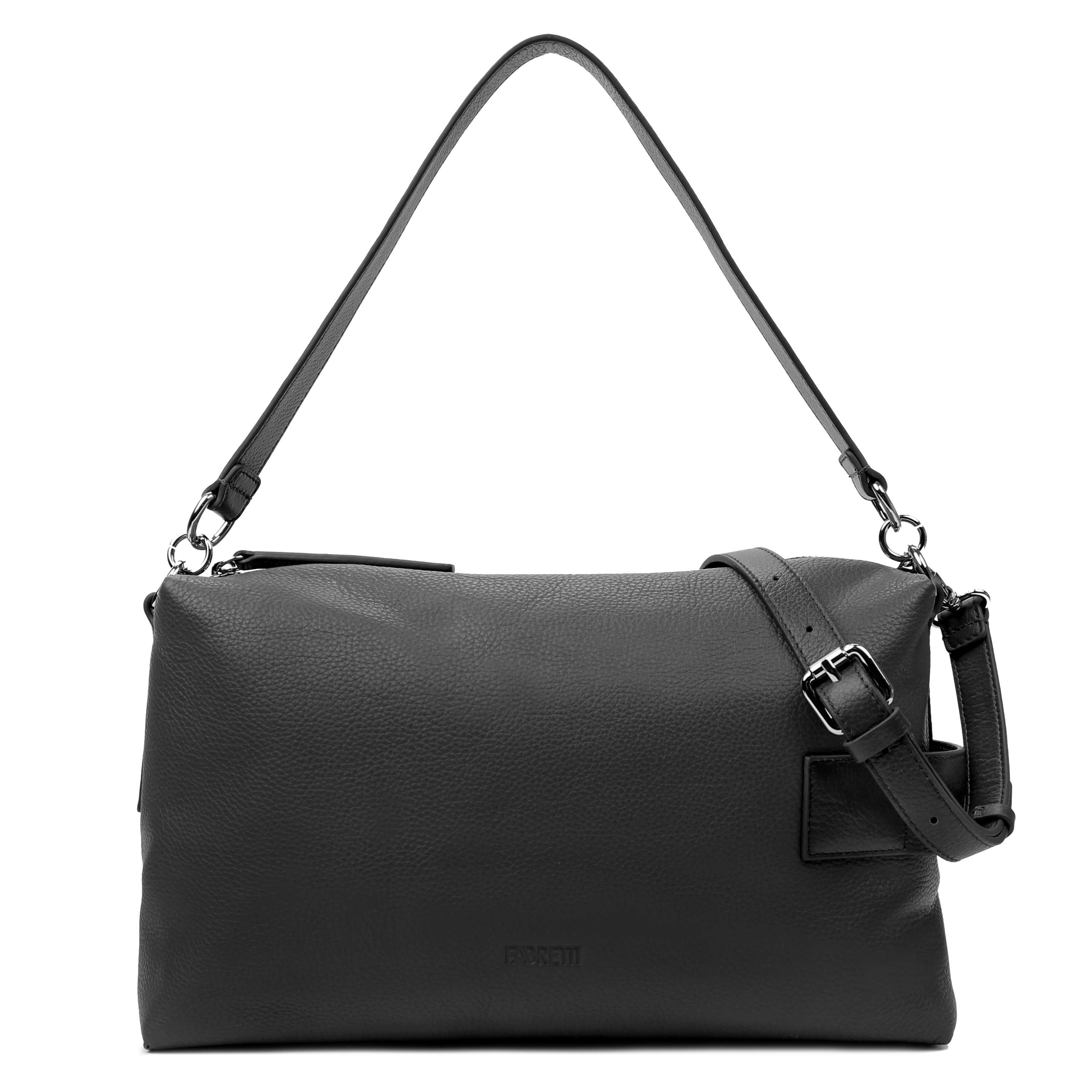 Стильная сумка FABRETTI в черном цвете. Сделана из натуральной высококачественной зернистой кожи. Основное отделение закрывается на молнию с кожаным пуллером. Внутри расположены два дополнительных кармана: на молнии и быстрого доступа. На тыльной стороне имеется еще один дополнительный карман. Сбоку сумка декорирована небольшим ремешком. Укомплектована двумя ремешками, один из которых регулируется по длина за счет пряжки, длина ремешка - 128 см. Таким образом, сумку можно носить как на плече, так и как кросс-боди. На лицевой стороне сумка декорирована тиснением с названием бренда. Вся фурнитура - золотого цвета. Материал подкладки: полиэстер.