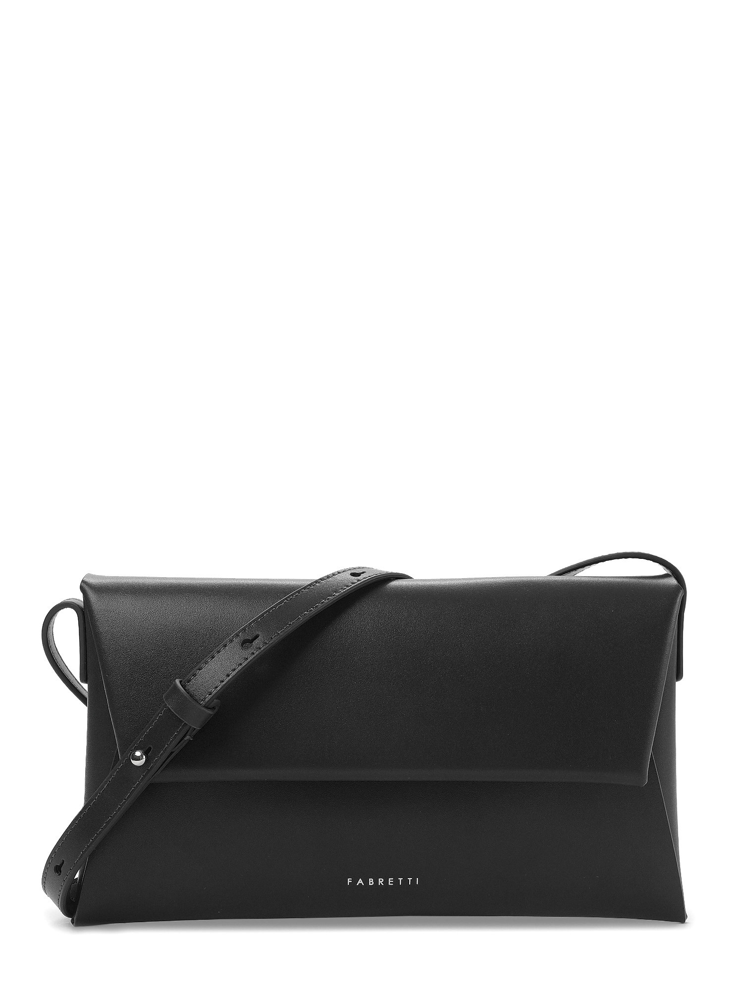 Лаконичная женская сумка-конверт итальянского бренда FABRETTI из гладкой черной кожи кальф. За простыми формами скрыт сложный дизайн – сумка собрана без швов в виде классического делового конверта, и без лишнего декора и фурнитуры – только строгое тиснение с лого на лицевой стороне.