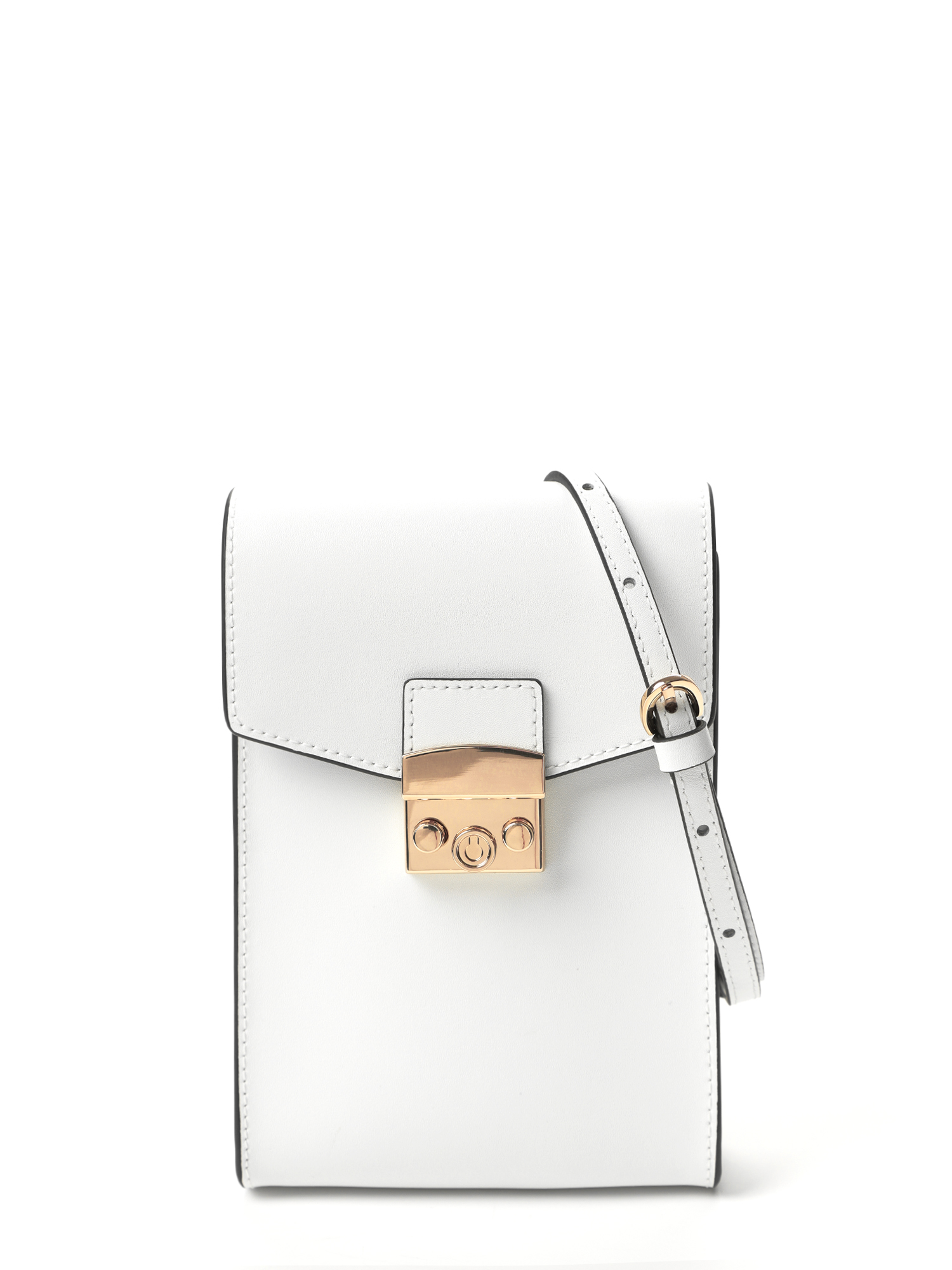 Маленькая женская сумка кросс-боди итальянского бренда FABRETTI из гладкой кожи кальф чистого белого цвета – женственная модель с жестким прямоугольным каркасом. Сумочка закрывается клапаном с необычным защелкивающим замком, внутри небольшой открытый карман. Узкий плечевой ремешок крепится небольшими карабинами к тыльной стороне сумки. Длина регулируется пряжкой. Четкую геометрию сумки подчеркивает контрастный черный кант по срезам.