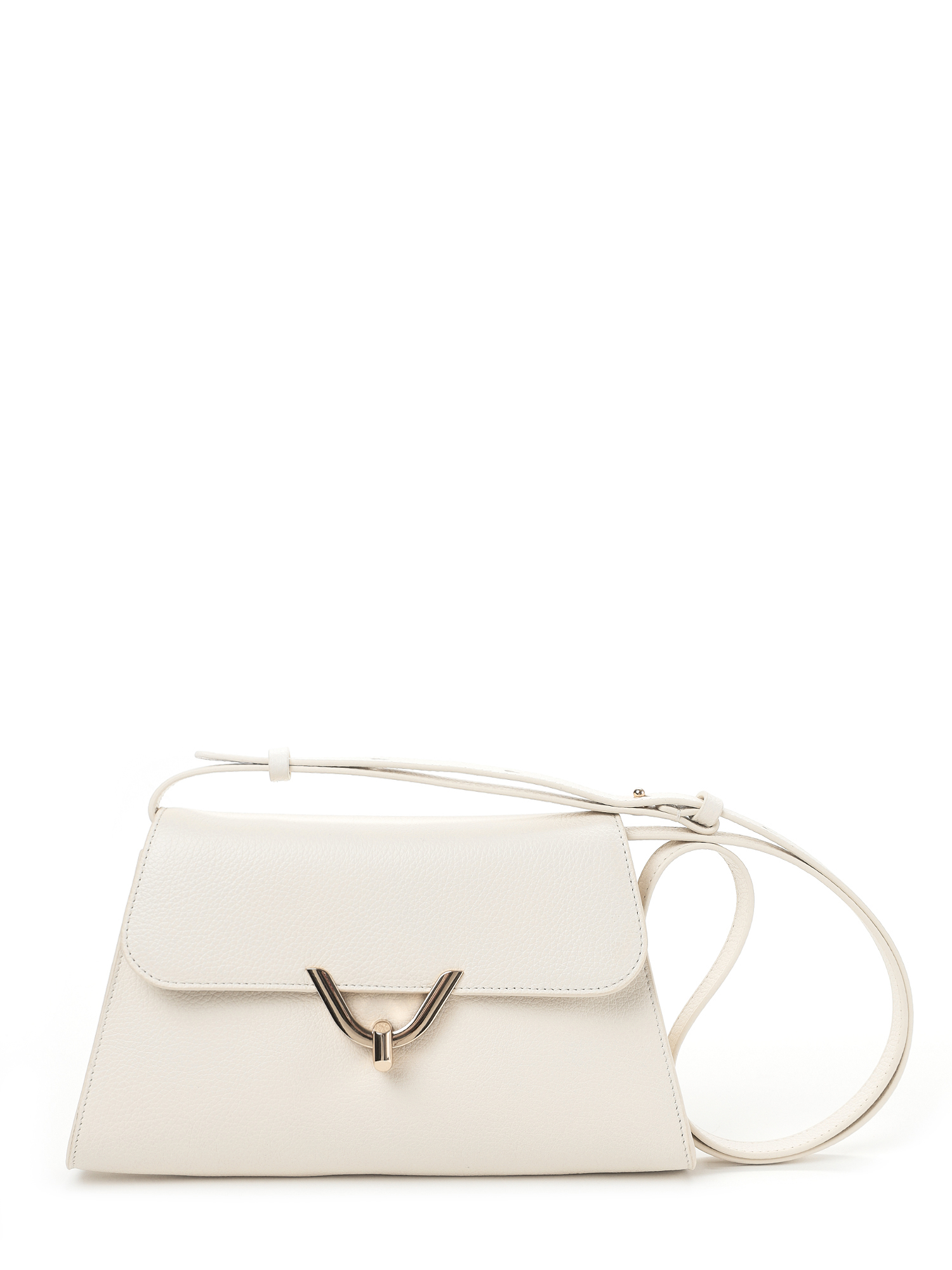 Небольшая женская сумка багет итальянского бренда FABRETTI из натуральной кожи с зернистой фактурой в нежном оттенке топленого молока. Изящная модель в форме трапеции, закрывающаяся клапаном с лаконичным V-образным поворотным замком в золоте. Внутри одно отделение с небольшим открытым карманом.
