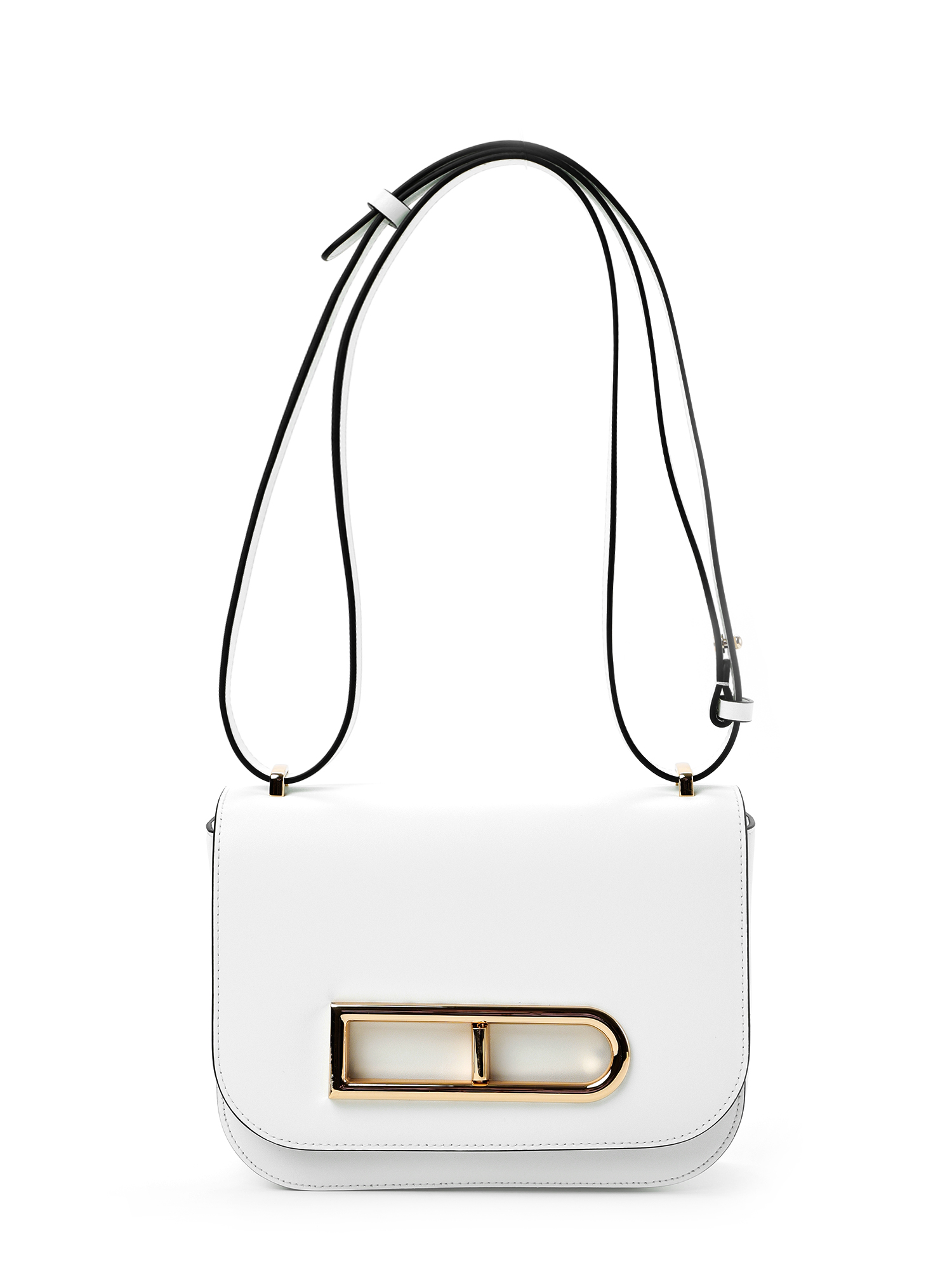 Эффектная женская сумка кросс-боди итальянского бренда FABRETTI из натуральной кожи кальф нежного белого цвета с гладкой фактурой. Чтобы подчеркнуть форму сумки, срезы швов отделаны контрастным черным кантом.