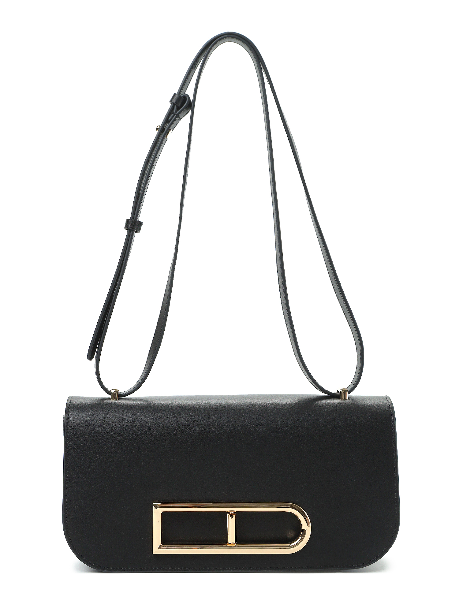 Модель закрывается на клапан с необычным поворотным замком в золотистой металлической рамке. Внутри отделения два кармана – открытый и на молнии. На тыльной стороне сумки расположен открытый карман.