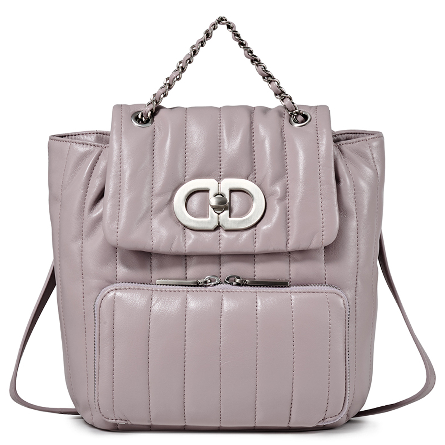 Рюкзак выполнен из мягкой, приятной на ощупь кожи светло-фиолетового цвета. Верхняя часть рюкзака украшена стильным металлическим замком, добавляющим изюминку дизайну. Замок надежно фиксирует содержимое, обеспечивая безопасность Ваших вещей. Размеры рюкзака идеально подходят для повседневного использования. Его габариты позволяют вместить все необходимые вещи: телефон, кошелек, ключи и другие мелочи. Для удобства хранения мелких предметов предусмотрен дополнительный передний карман на молнии. Цвет фурнитуры - серебро.