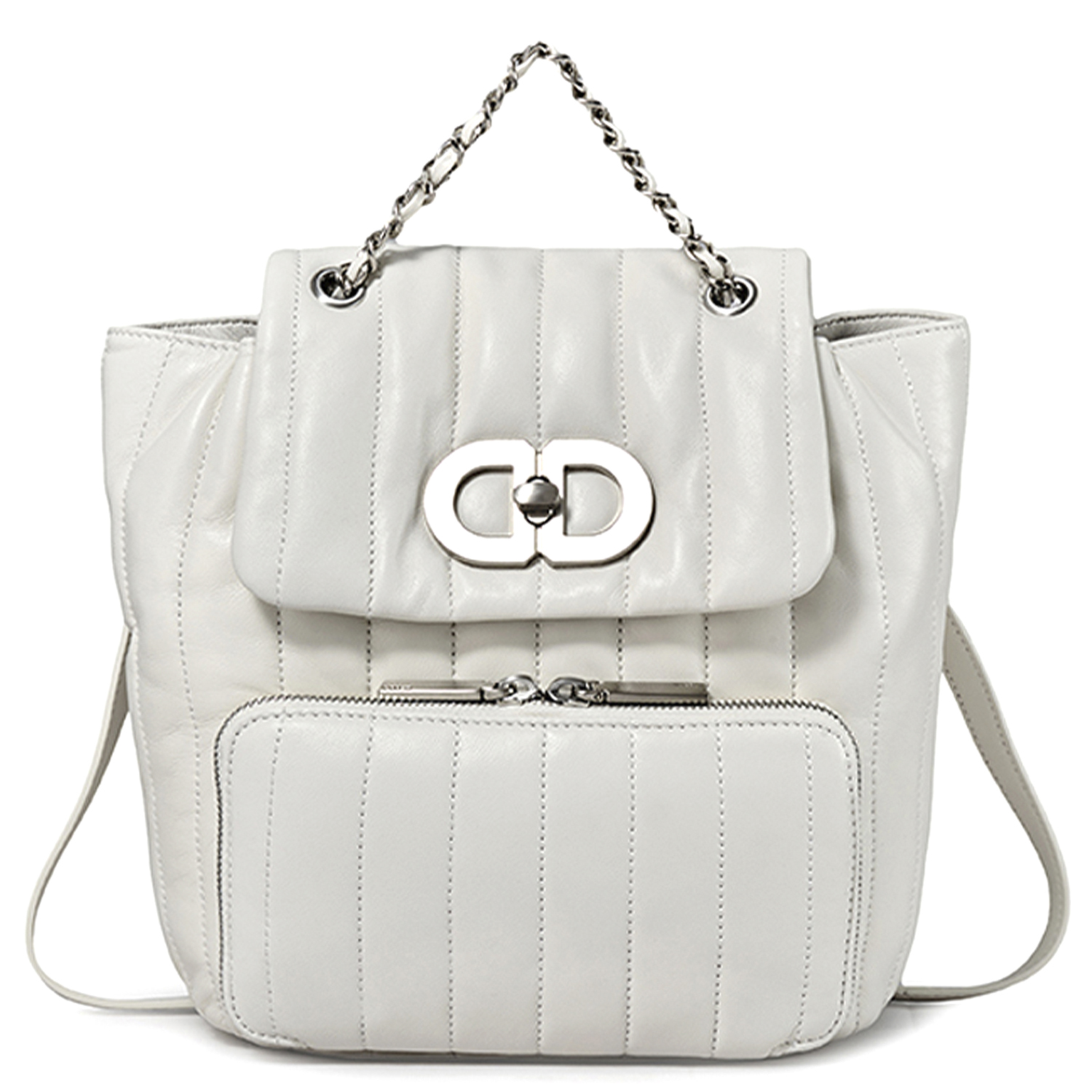 Рюкзак выполнен из мягкой, приятной на ощупь кожи белого цвета. Верхняя часть рюкзака украшена стильным металлическим замком, добавляющим изюминку дизайну. Замок надежно фиксирует содержимое, обеспечивая безопасность Ваших вещей. Размеры рюкзака идеально подходят для повседневного использования. Его габариты позволяют вместить все необходимые вещи: телефон, кошелек, ключи и другие мелочи. Для удобства хранения мелких предметов предусмотрен дополнительный передний карман на молнии. Цвет фурнитуры - серебро.