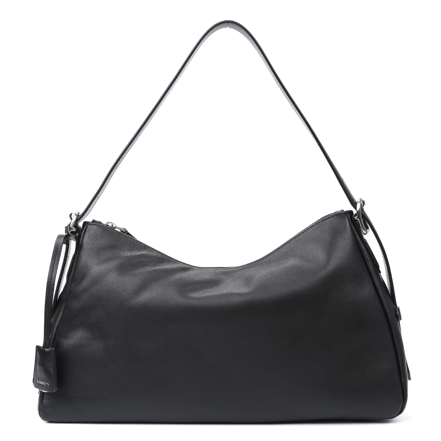 Стильная сумка-хобо FABRETTI в черном цвете, выполненная из натуральной высококачественной кожи. Основное отделение закрывается на молнию, внутри - карман на молнии и карман быстрого доступа. Карман на молнии с тыльной стороны. Аксессуар имеет регулируемый ремень, длина - 68 см, ширина - 2 см. Длина ремня регулируется за счет пряжки. Вся фурнитура -серебряного цвета. Материал подкладки: хлопок.