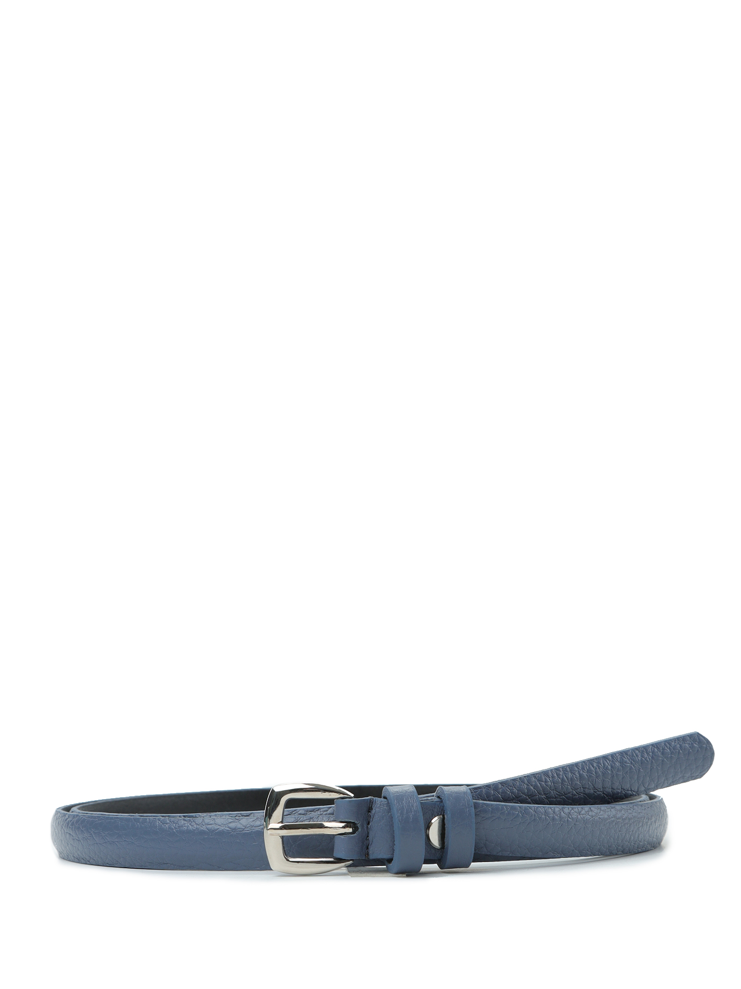 Узкий женский ремень итальянского бренда FABRETTI в необычном темно-голубом цвете выполнен из натуральной кожи с крупнозернистой фактурой. Тыльная сторона - из гладкого плотного спила.