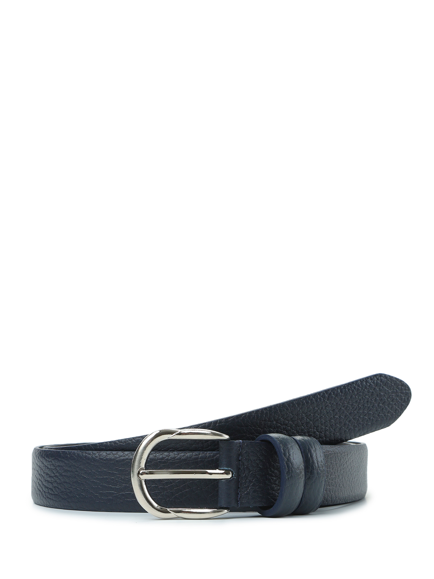 Базовый женский ремень итальянского бренда FABRETTI в темно-синем цвете, выполнен из натуральной кожи с крупнозернистой фактурой. Тыльная сторона из гладкой натуральной кожи.
