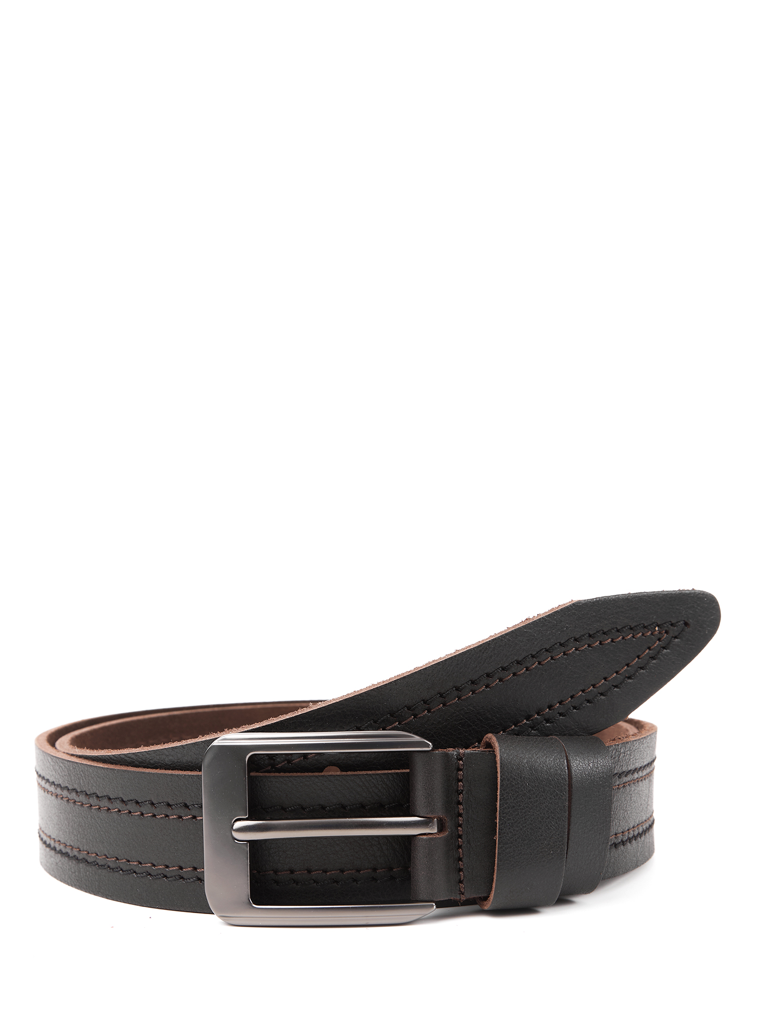Широкий мужской ремень для джинсов от итальянского бренда FABRETTI выполнен из мягкой натуральной кожи в холодном темно-коричневом цвете с двумя парами цветных строчек по центру – коричневыми и черными. Лицевая сторона с зернистой фактурой, тыльная – классический замшевый спил. Ремень дополнен крупной прямоугольной пряжкой в цвете «черненый никель».  Две шлевки из гладкой кожи в тон изделию: одна широкая закреплена, вторая - подвижная. Пряжка съемная, на винте, для самостоятельной корректировки длины ремня.