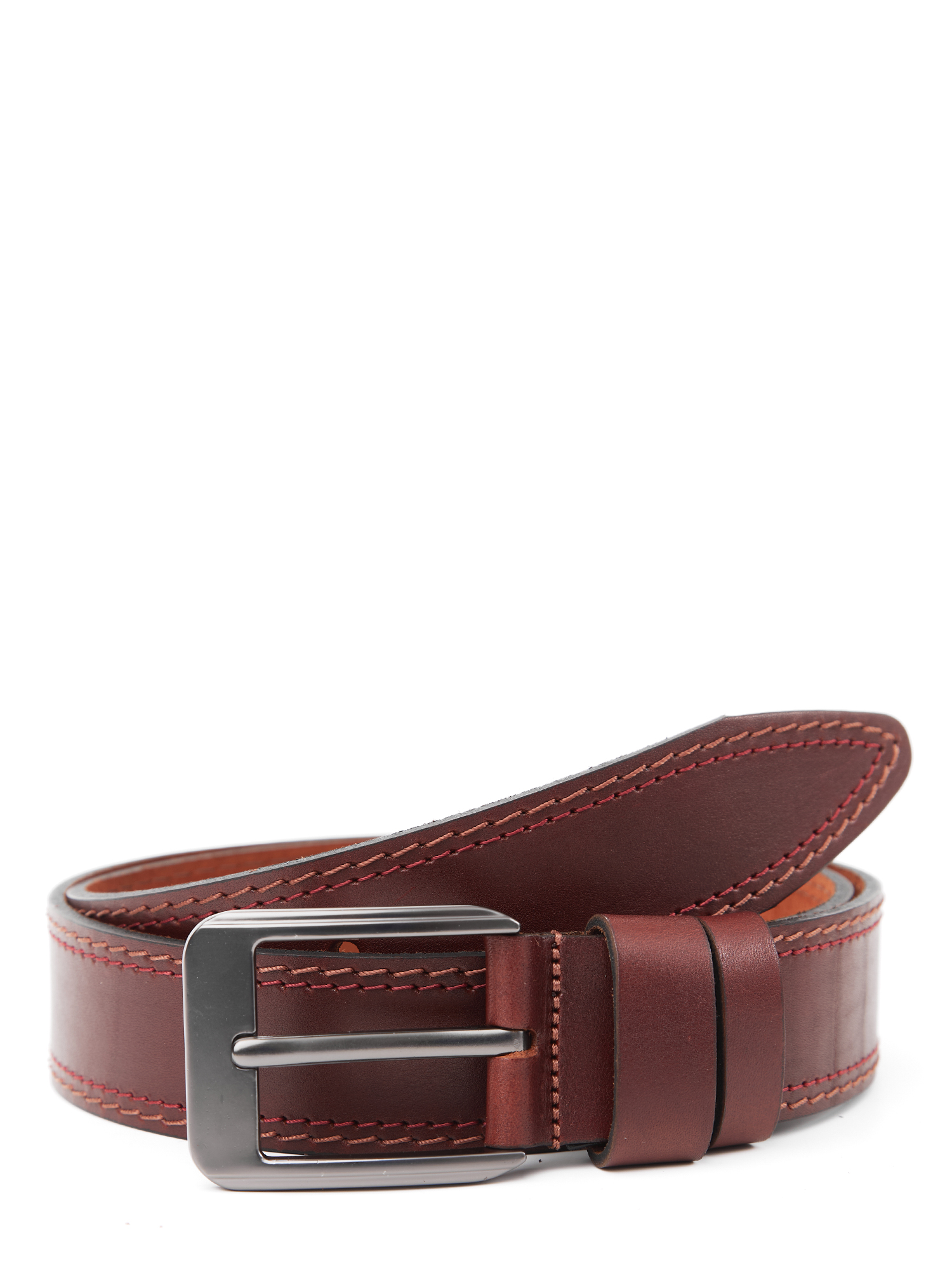 Стильный мужской ремень для джинсов от итальянского бренда FABRETTI выполнен из натуральной кожи в благородном оттенке бордо с двумя цветными строчками по краям – красными и оранжевыми. Лицевая сторона с гладкой фактурой, тыльная – классический замшевый спил. Ремень дополнен крупной прямоугольной пряжкой в цвете «черненый никель».  Две шлевки из гладкой кожи в тон изделию: одна широкая закреплена, вторая - подвижная. Пряжка съемная, на винте, для самостоятельной корректировки длины ремня.