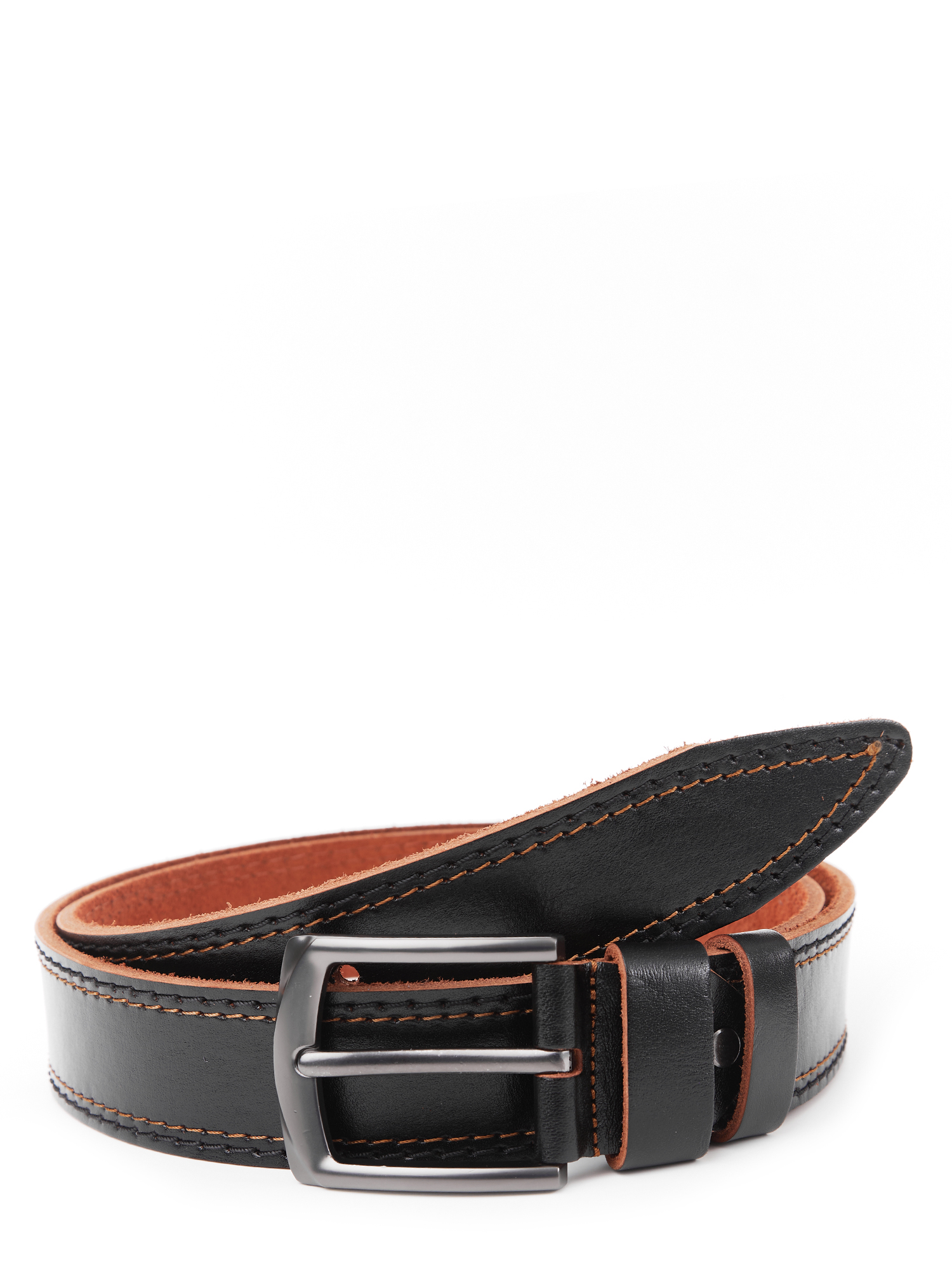 Стильный мужской ремень для джинсов от итальянского бренда FABRETTI выполнен из натуральной кожи в черном цвете с двумя цветными строчками по краям – черными и оранжевыми. Тыльная сторона и края теплого оранжевого оттенка. Лицевая сторона с гладкой фактурой, тыльная – классический замшевый спил. Ремень дополнен крупной прямоугольной пряжкой в цвете «черненый никель».  Две шлевки из гладкой кожи в тон изделию: одна широкая закреплена, вторая - подвижная. Пряжка съемная, на винте, для самостоятельной корректировки длины ремня.
