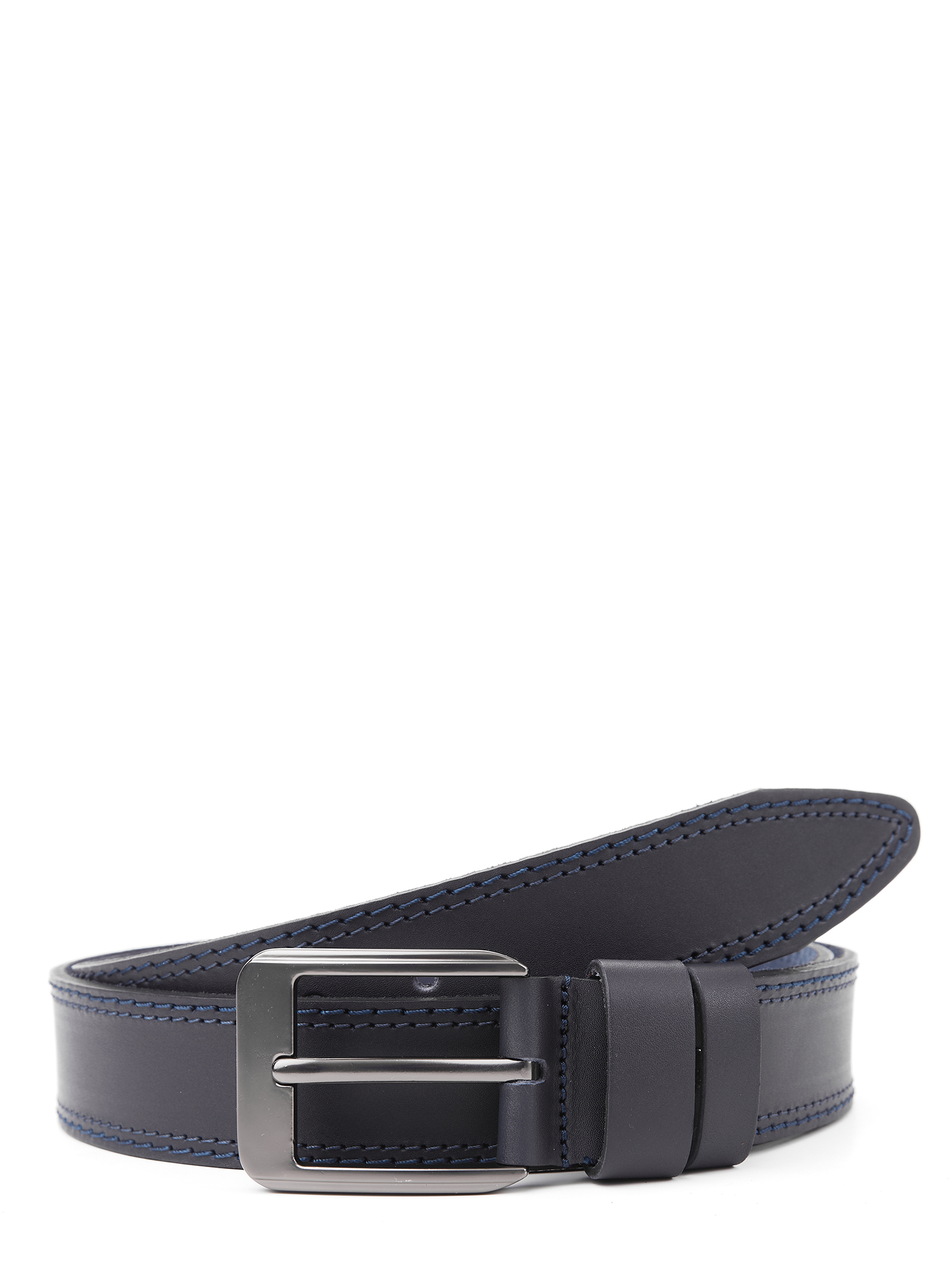 Классический широкий мужской ремень для джинсов от итальянского бренда FABRETTI выполнен из натуральной кожи в темно-синем цвете. Лицевая сторона с гладкой мелкозернистой фактурой, тыльная – классический спил. Ремень дополнен крупной прямоугольной пряжкой в цвете «черненый никель».  Две шлевки из гладкой кожи в тон изделию: одна широкая закреплена, вторая - подвижная. Пряжка съемная, на винте, для самостоятельной корректировки длины ремня. Полотно ремня украшено двумя парами строчек по краям.