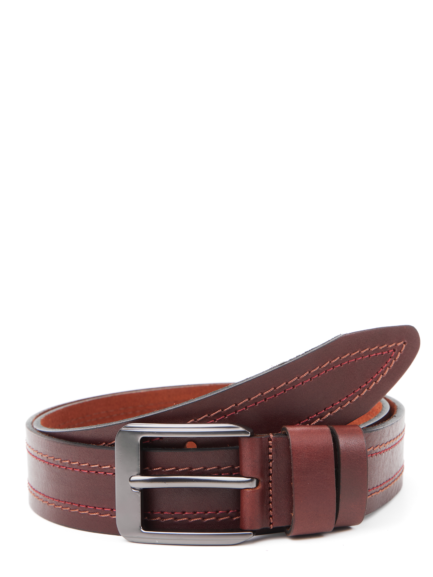 Классический широкий мужской ремень для джинсов от итальянского бренда FABRETTI выполнен из натуральной кожи в роскошном бордово-коричневом цвете. Лицевая сторона с гладкой мелкозернистой фактурой, тыльная – классический спил. Ремень дополнен крупной прямоугольной пряжкой в цвете «черненый никель».  Две шлевки из гладкой кожи в тон изделию: одна широкая закреплена, вторая - подвижная. Пряжка съемная, на винте, для самостоятельной корректировки длины ремня. Полотно ремня украшено двумя парами цветных строчек.