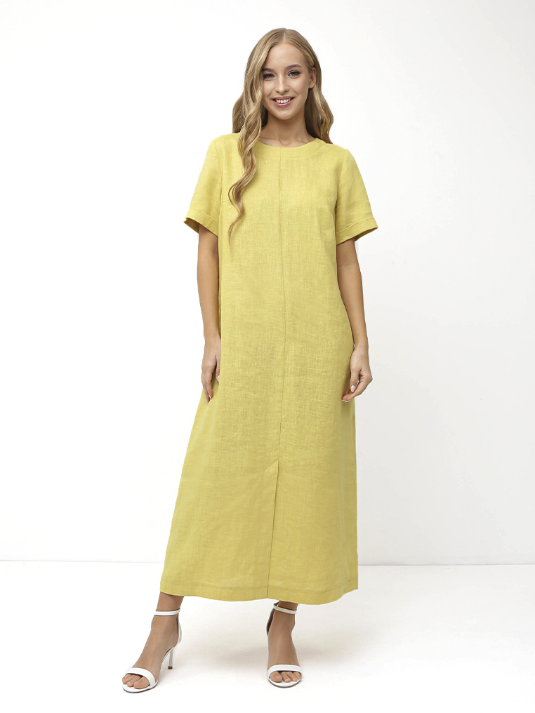 Летнее женское платье итальянского бренда FABRETTI выполнено из легкой высококачественной премиум-ткани - 100% лён. Удобное, легкое, приятное к телу. Платье длины миди имеет классический круглый вырез, короткие рукава и центральный разрез.
