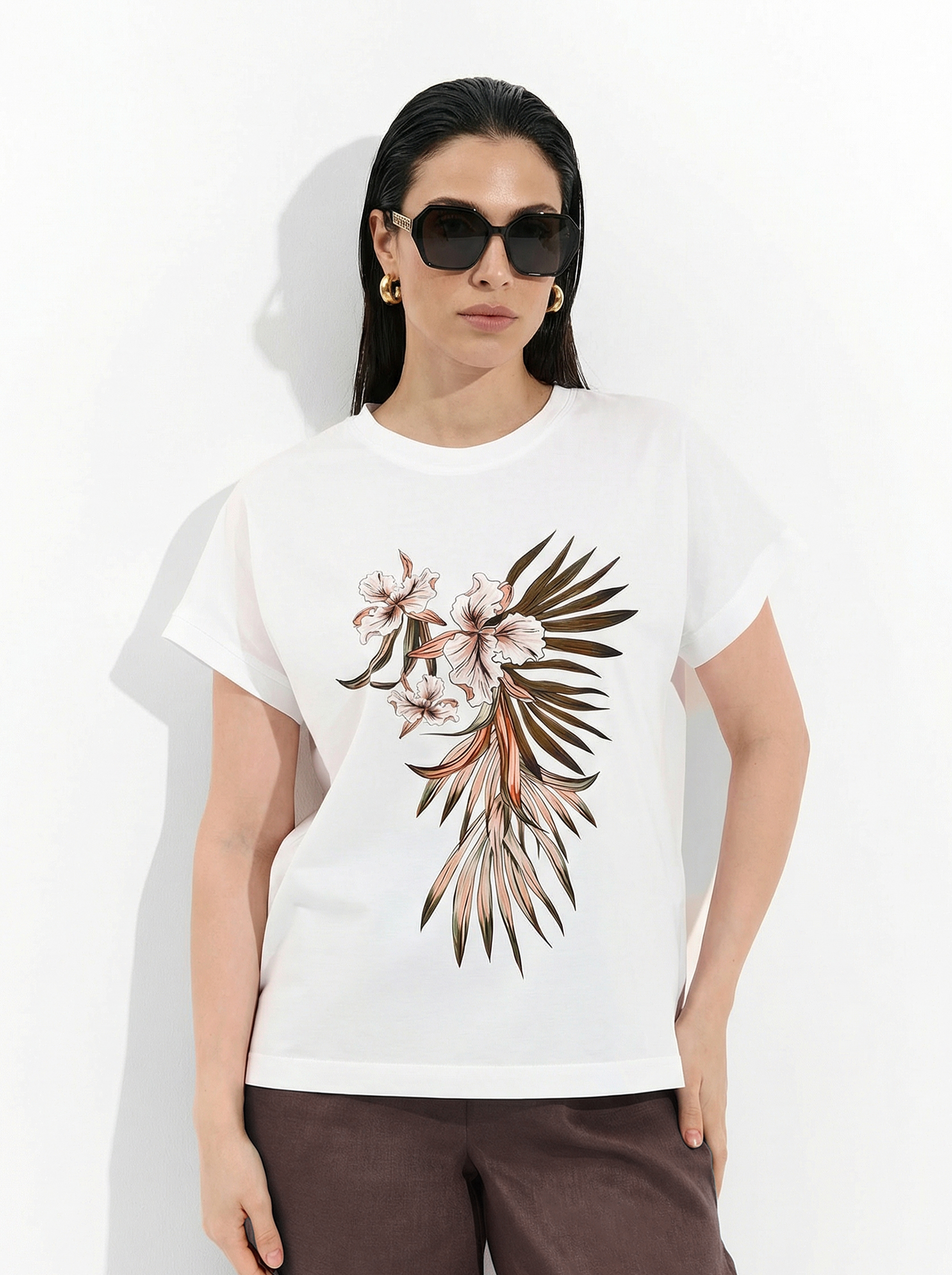 Летняя женская футболка итальянского бренда FABRETTI белого цвета с большим цветным принтом в виде цветов и листьев тропических орхидей – базовая, но элегантная модель для повседневного летнего гардероба.