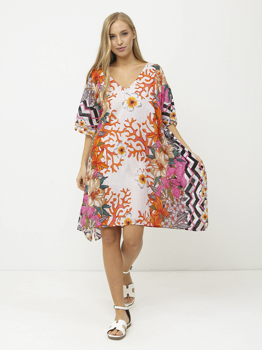 Летнее женское платье итальянского бренда FABRETTI выполнено из высококачественного хлопка. Удобное, легкое, приятное к телу. Свободный крой обеспечивает максимальный комфорт и свободу движений, а длина мини подчеркивает элегантность и женственность. Платье украшено ярким тропическим принтом с изображением цветов и корралов. Рукава длиной три четверти и вырез лодочкой добавляют платью оригинальности и комфорта. По бокам расположены удобные карманы.