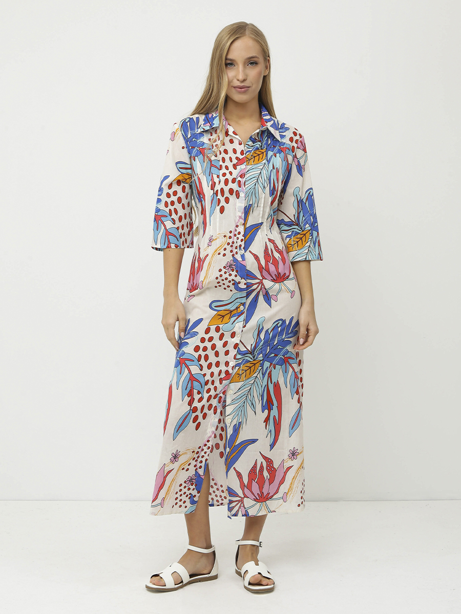 Летнее женское платье итальянского бренда FABRETTI выполнено из высококачественного хлопка. Удобное, легкое, приятное к телу. Свободный крой обеспечивает максимальный комфорт и свободу движений, а длина миди подчеркивает элегантность и женственность. Платье украшено ярким тропическим принтом. Платье застегивается на пуговицы спереди, а рукава три четверти обеспечивают комфорт и свободу движений. Классический воротник добавляет образу женственности и утонченности.