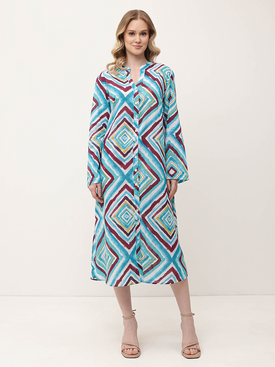 Летнее женское платье итальянского бренда FABRETTI выполнено из высококачественного хлопка. Удобное, легкое, приятное к телу. Свободный крой обеспечивает максимальный комфорт и свободу движений, а длина миди подчеркивает элегантность и женственность. Платье украшено ярким принтом. Платье застегивается на пуговицы спереди, а длинные рукава обеспечивают комфорт и свободу движений. Вырез V-образный добавляет образу женственности и утонченности.