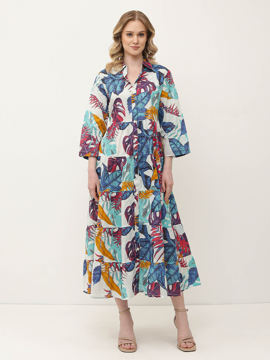 Летнее женское платье итальянского бренда FABRETTI выполнено из высококачественного хлопка. Удобное, легкое, приятное к телу. Свободный крой обеспечивает максимальный комфорт и свободу движений, а длина миди подчеркивает элегантность и женственность. Платье украшено ярким принтом. Платье застегивается на пуговицы спереди, а рукава три четверти обеспечивают комфорт и свободу движений. Классический воротник добавляет образу женственности и утонченности.