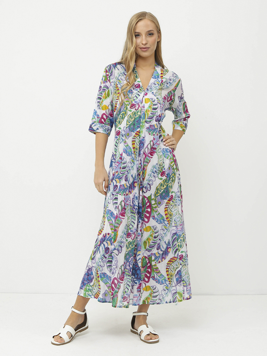 Летнее женское платье итальянского бренда FABRETTI выполнено из высококачественного хлопка. Удобное, легкое, приятное к телу. Свободный крой обеспечивает максимальный комфорт и свободу движений, а длина миди подчеркивает элегантность и женственность. Платье украшено ярким принтом. Платье застегивается на пуговицы спереди, а рукава три четверти обеспечивают комфорт и свободу движений. Вырез V-образный добавляет образу женственности и утонченности.