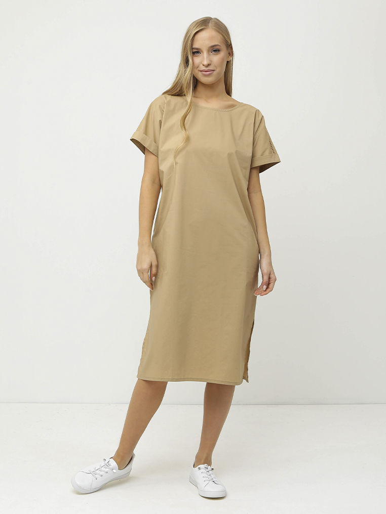 Женское платье итальянского бренда FABRETTI выполнено из высококачественного хлопка. Удобное, легкое, приятное к телу. Платье длины миди имеет круглый вырез и короткие рукава. На рукавах расположены небольшие декоративные элементы, добавляющие изюминку дизайну. Боковые разрезы обеспечивают удобство и свободу движений.