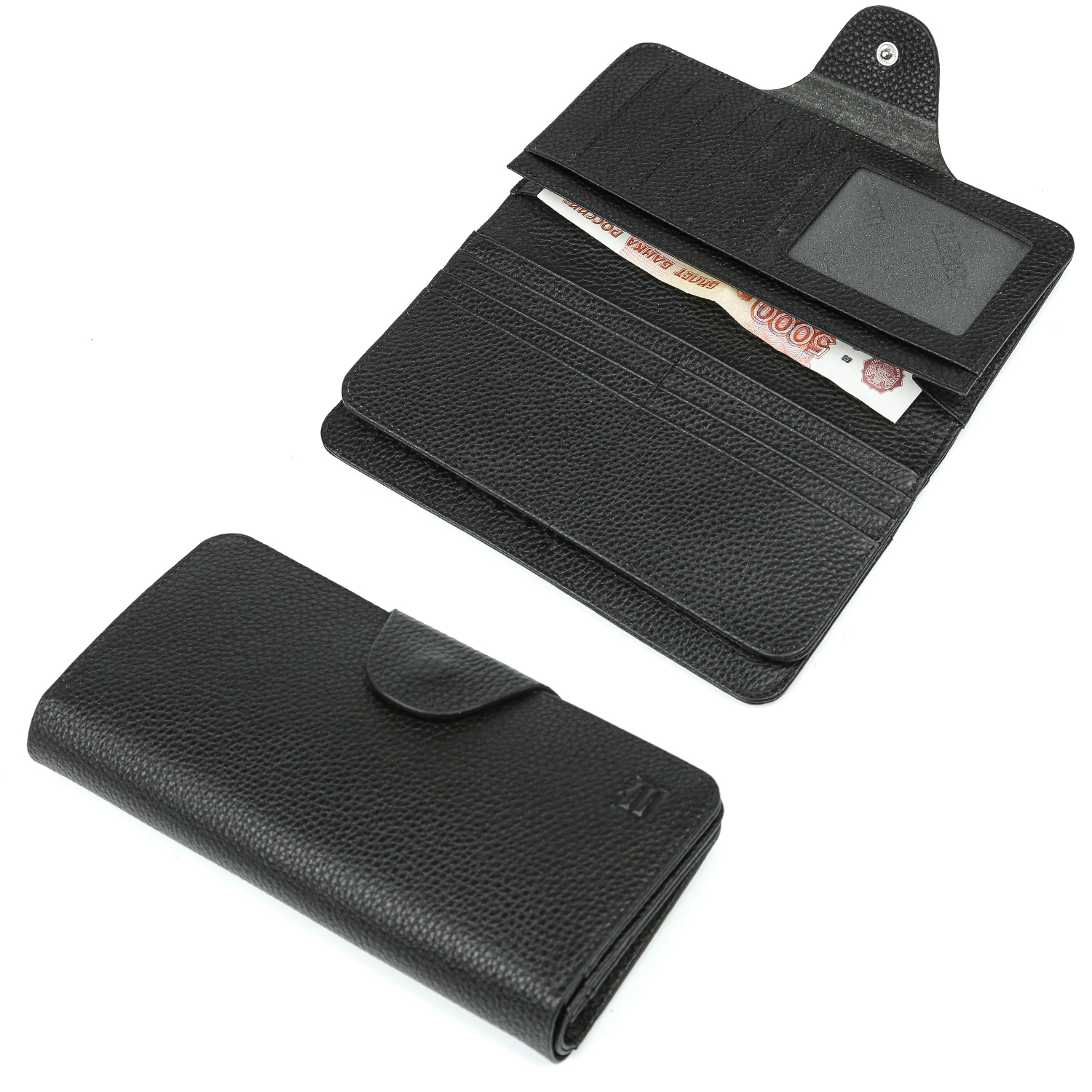 Аксессуар закрывается хлястиком с кнопкой и сконструирован по типу книжки. Внутри 1 основное отделение на полную купюру, 7 вместительных открытых карманов, 22 слота для хранения банковских карт, 4 из которых - с прозрачной вставкой. На тыльной стороне предусмотрен карман быстрого доступа на молнии. Цвет фурнитуры - серебро.