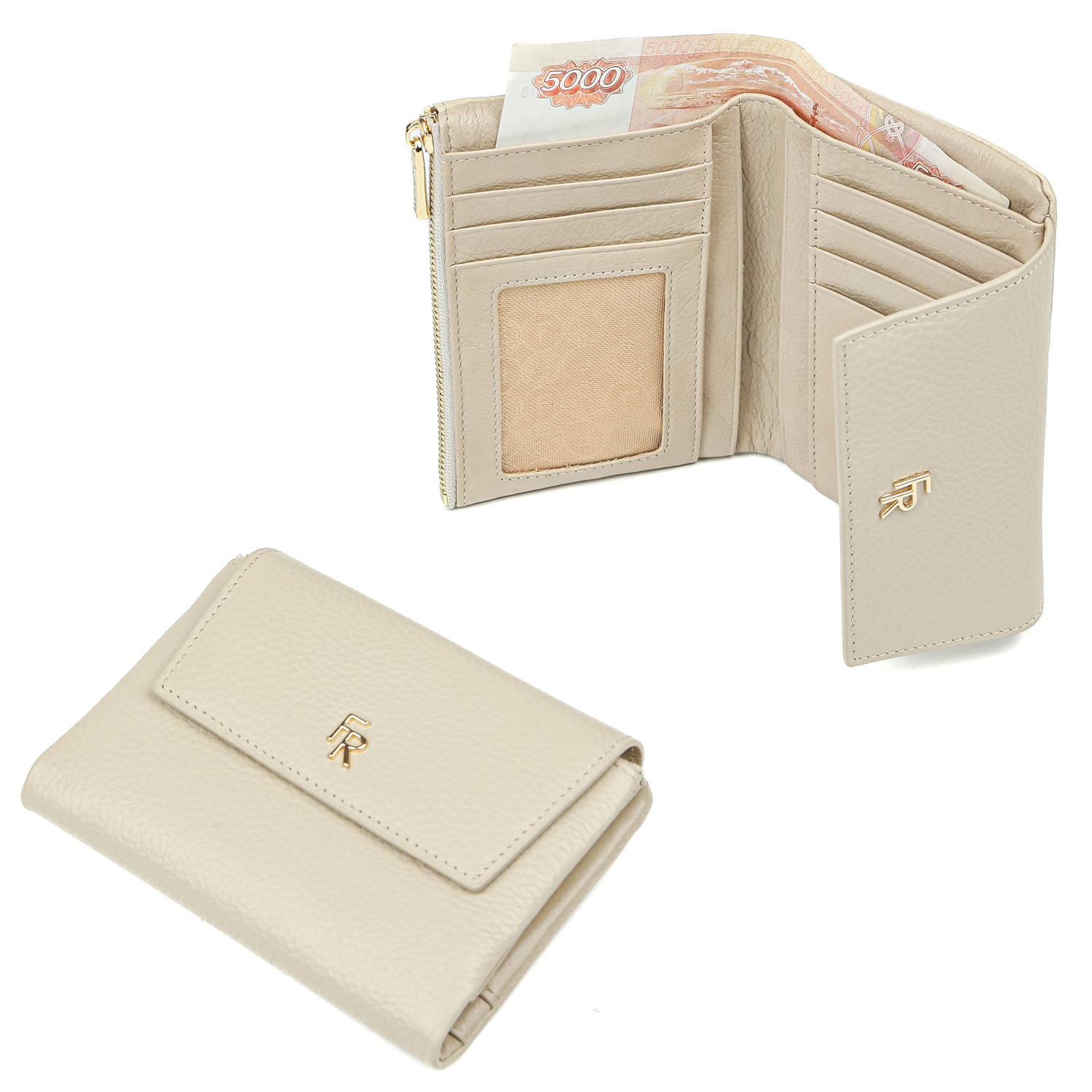 Женский складной кошелек FABRETTI в бежевом оттенке выполнен из натуральной зернистой кожи. Аксессуар закрывается клапаном с потайными магнитными кнопками. Внутри 1 отделение для купюр, 1 боковой карман на молнии, 11 слотов для дисконтных и банковских карт, один из которых - с прозрачной вставкой. Отделение для монет расположено на тыльной стороне аксессуара и закрывается на молнию. Цвет фурнитуры - золото.