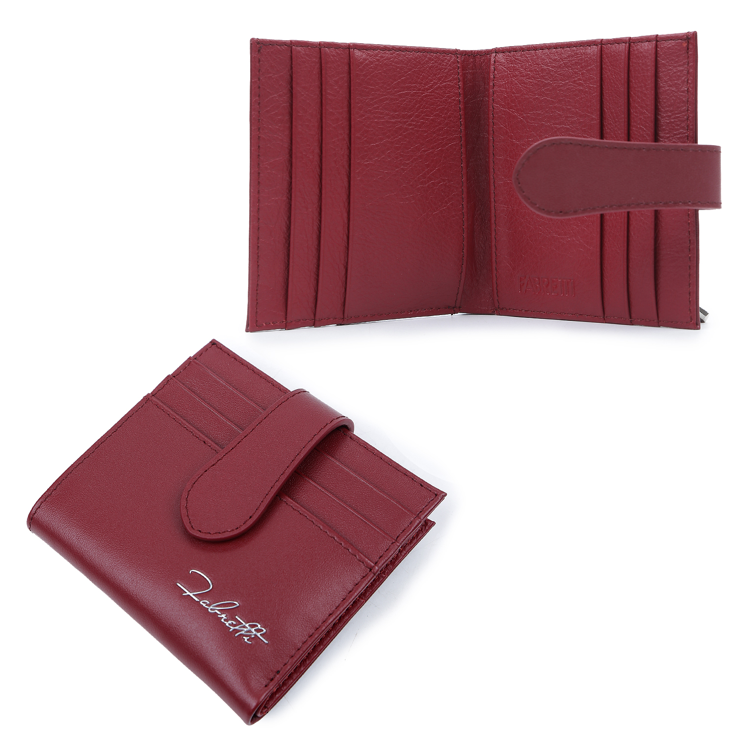 Складной кошелек итальянского бренда FABRETTI выполнен из натуральной гладкой кожи в бордовом оттенке. Основное отделение закрывается на хлястик с кнопкой. Внутри одно отделение для купюр, шесть слотов для пластиковых карт и два открытых кармана. На лицевой стороне расположены три кармана и декор в виде фирменного логотипа. На тыльной стороне небольшой карман на молнии для монет.