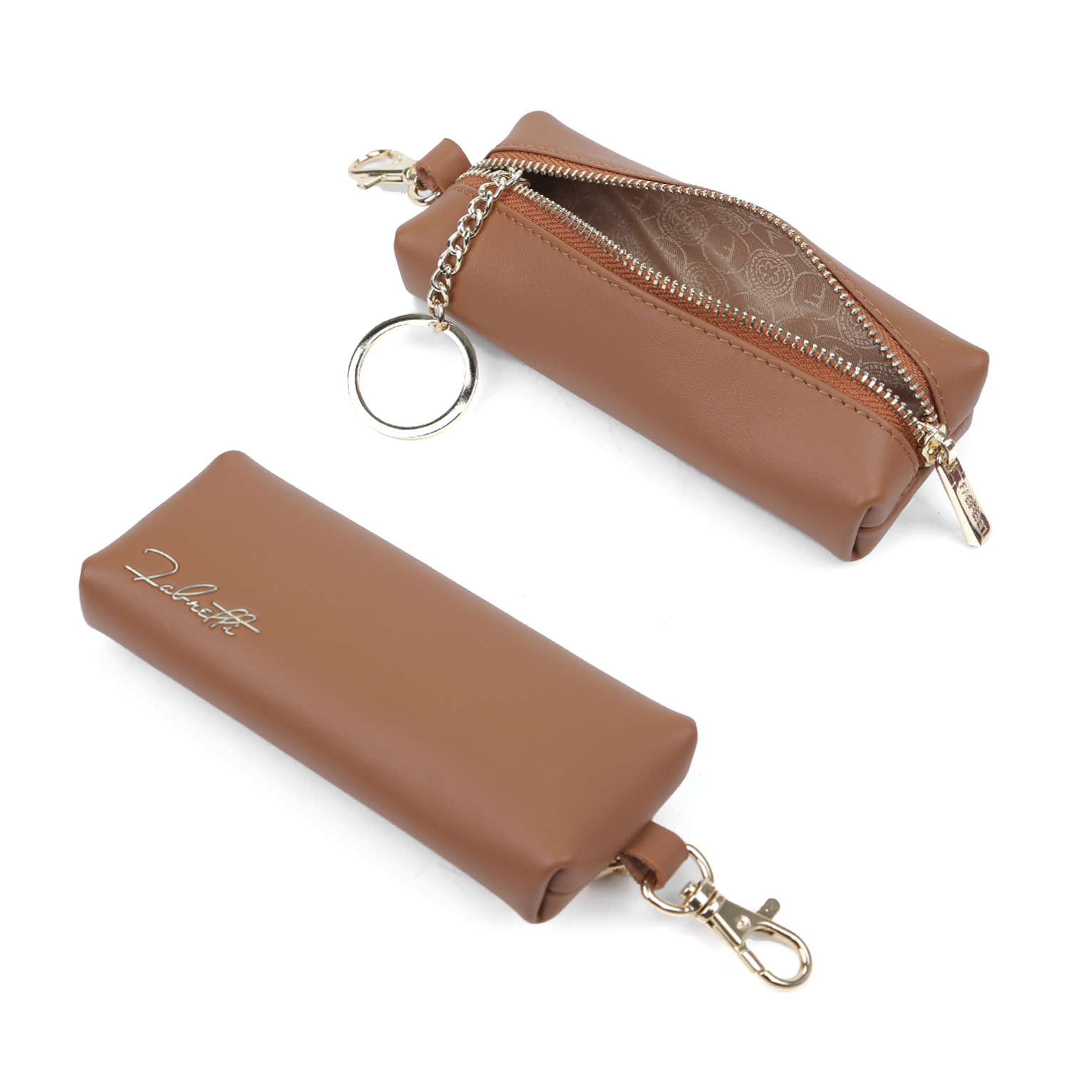 Внутри одно отделение для ключей с подкладкой, дополненное металлическим держателем для ключей на цепочке. Застегивается на молнию. На внешней стороне предусмотрен карабин.