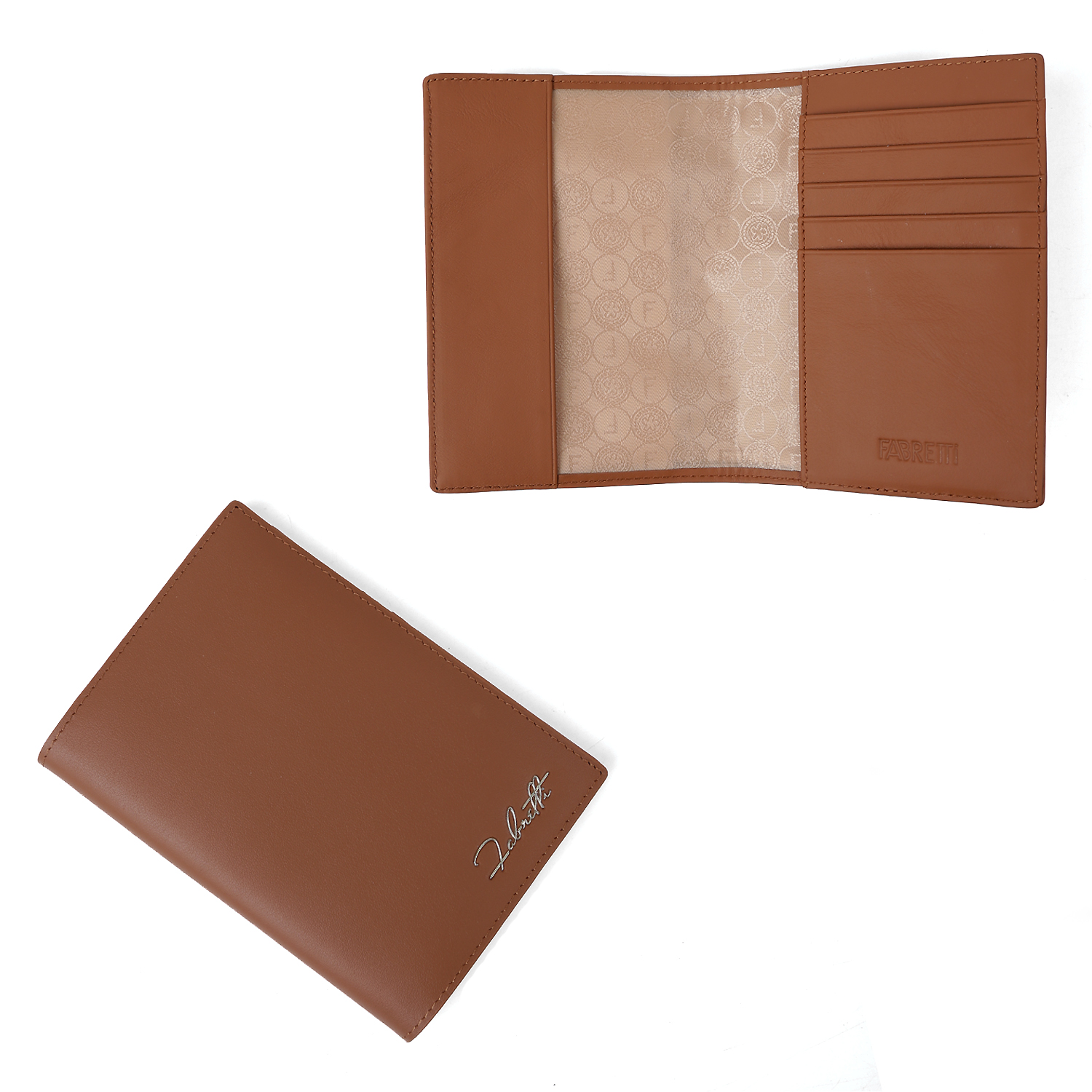 Обложка для документов итальянского бренда FABRETTI сочетает функциональность, качество и стиль. Аксессуар надежно защищает содержимое от механических повреждений, солнечных лучей, влаги. Модель выполнена из натуральной гладкой кожи в светло-коричневом цвете. Внутри отделение для паспорта и пять слотов для пластиковых карт. На лицевой стороне изящный логотип.