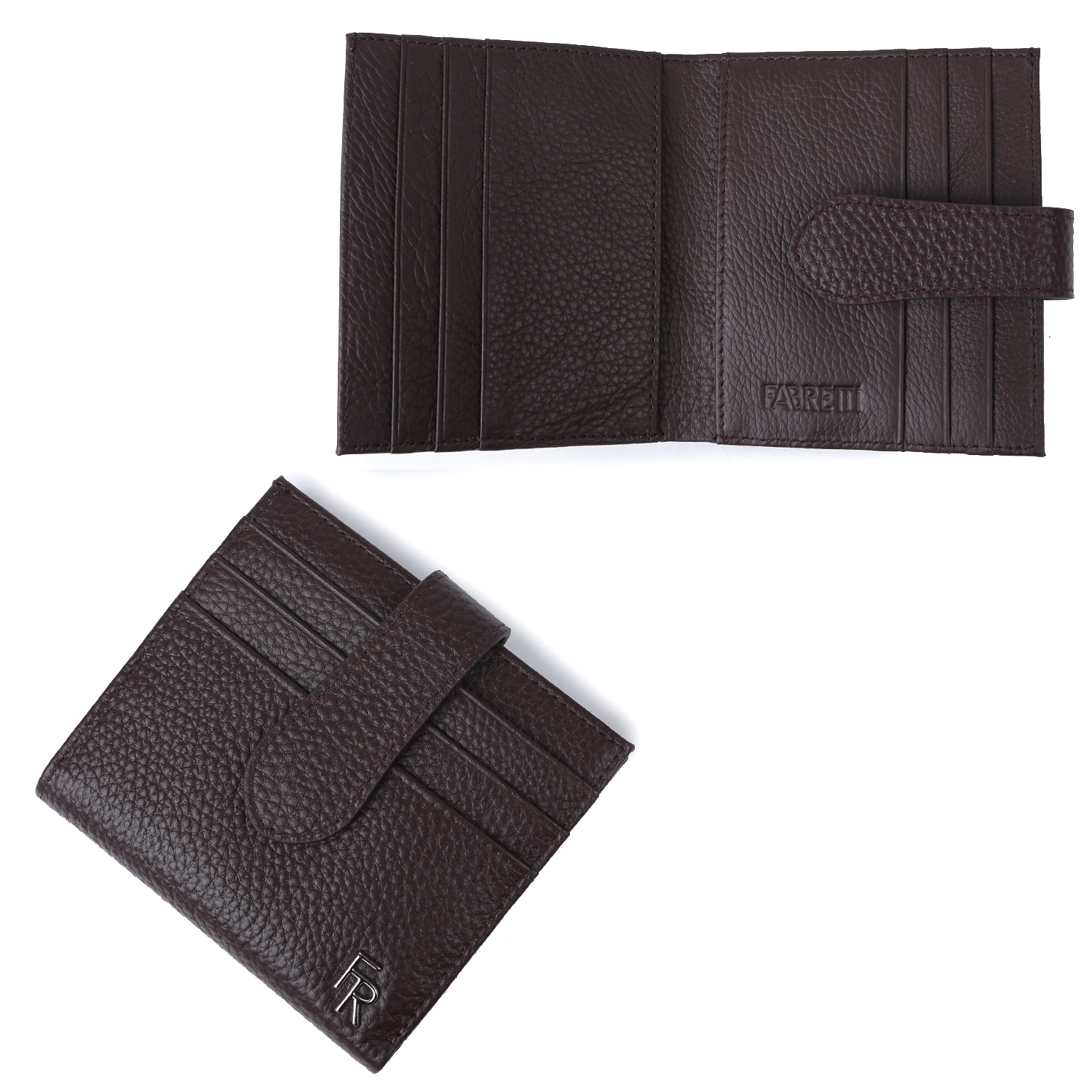 Складной кошелек итальянского бренда FABRETTI выполнен из натуральной крупнозернистой кожи в темно-коричневом оттенке. Основное отделение закрывается на хлястик с кнопкой. Внутри одно отделение для купюр, шесть слотов для пластиковых карт и два открытых кармана. На лицевой стороне расположены три кармана и декор в виде фирменного логотипа. На тыльной стороне небольшой карман на молнии для монет.